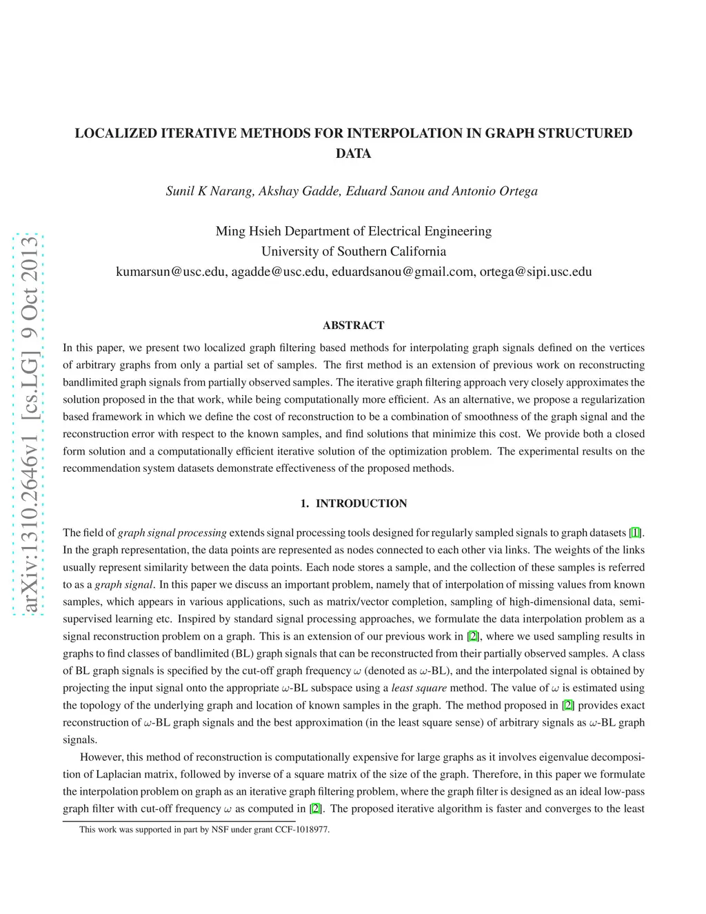 In this paper, we present two localized graph filtering based methods for interpolating graph signals defined on the vertices of arbitrary graphs from only a partial set of samples. The first method is an extension of previous work on reconstructing bandlimited graph signals from partially observed samples. The iterative graph filtering approach very closely approximates the solution proposed in the that work, while being computationally more efficient. As an alternative, we propose a regularization based framework in which we define the cost of reconstruction to be a combination of smoothness of the graph signal and the reconstruction error with respect to the known samples, and find solutions that minimize this cost. We provide both a closed form solution and a computationally efficient iterative solution of the optimization problem. The experimental results on the recommendation system datasets demonstrate effectiveness of the proposed methods.