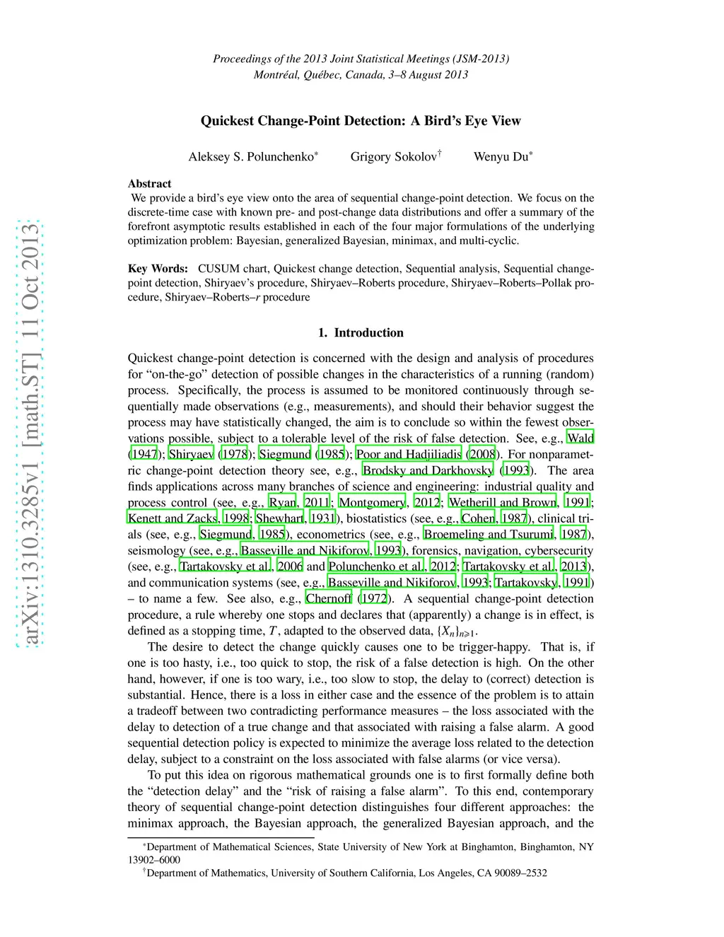 We provide a bird's eye view onto the area of sequential change-point detection. We focus on the discrete-time case with known pre- and post-change data distributions and offer a summary of the forefront asymptotic results established in each of the four major formulations of the underlying optimization problem: Bayesian, generalized Bayesian, minimax, and multi-cyclic.