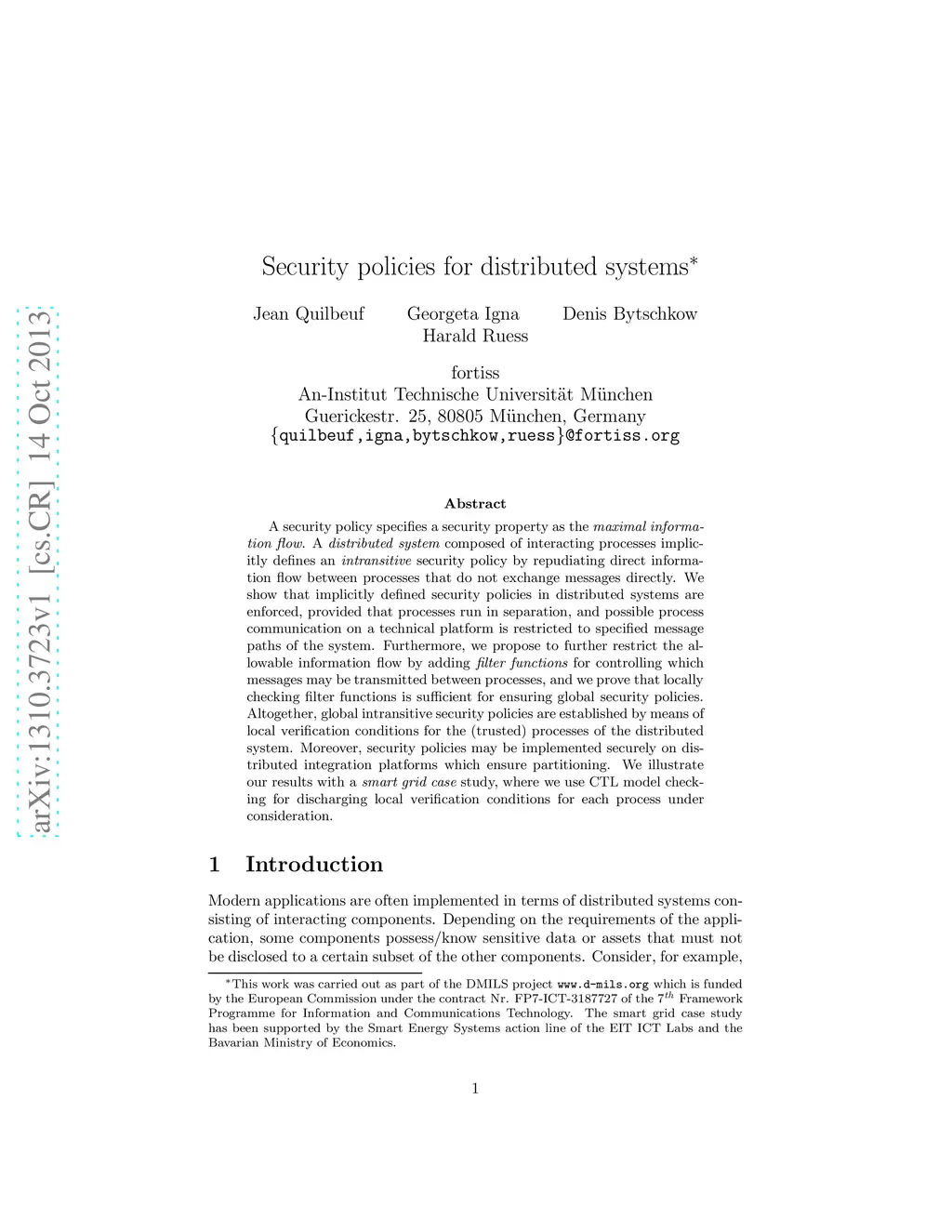 A security policy specifies a security property as the maximal information flow. A distributed system composed of interacting processes implicitly defines an intransitive security policy by repudiating direct information flow between processes that do not exchange messages directly. We show that implicitly defined security policies in distributed systems are enforced, provided that processes run in separation, and possible process communication on a technical platform is restricted to specified message paths of the system. Furthermore, we propose to further restrict the allowable information flow by adding filter functions for controlling which messages may be transmitted between processes, and we prove that locally checking filter functions is sufficient for ensuring global security policies. Altogether, global intransitive security policies are established by means of local verification conditions for the (trusted) processes of the distributed system. Moreover, security policies may be implemented securely on distributed integration platforms which ensure partitioning. We illustrate our results with a smart grid case study, where we use CTL model checking for discharging local verification conditions for each process under consideration.
