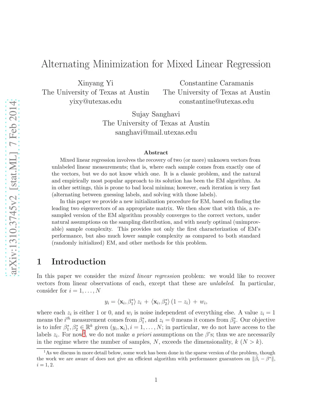 Mixed linear regression involves the recovery of two (or more) unknown vectors from unlabeled linear measurements; that is, where each sample comes from exactly one of the vectors, but we do not know which one. It is a classic problem, and the natural and empirically most popular approach to its solution has been the EM algorithm. As in other settings, this is prone to bad local minima; however, each iteration is very fast (alternating between guessing labels, and solving with those labels). In this paper we provide a new initialization procedure for EM, based on finding the leading two eigenvectors of an appropriate matrix. We then show that with this, a re-sampled version of the EM algorithm provably converges to the correct vectors, under natural assumptions on the sampling distribution, and with nearly optimal (unimprovable) sample complexity. This provides not only the first characterization of EM's performance, but also much lower sample complexity as compared to both standard (randomly initialized) EM, and other methods for this problem.