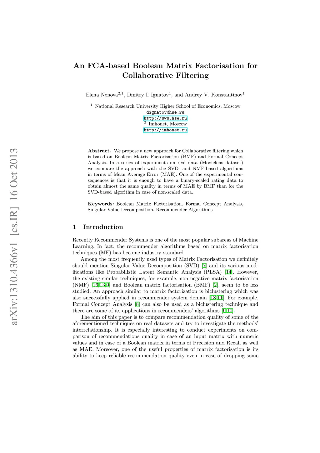 We propose a new approach for Collaborative Filtering which is based on Boolean Matrix Factorisation (BMF) and Formal Concept Analysis. In a series of experiments on real data (Movielens dataset) we compare the approach with the SVD- and NMF-based algorithms in terms of Mean Average Error (MAE). One of the experimental consequences is that it is enough to have a binary-scaled rating data to obtain almost the same quality in terms of MAE by BMF than for the SVD-based algorithm in case of non-scaled data.