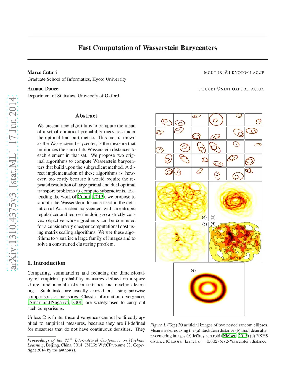 We present new algorithms to compute the mean of a set of empirical probability measures under the optimal transport metric. This mean, known as the Wasserstein barycenter, is the measure that minimizes the sum of its Wasserstein distances to each element in that set. We propose two original algorithms to compute Wasserstein barycenters that build upon the subgradient method. A direct implementation of these algorithms is, however, too costly because it would require the repeated resolution of large primal and dual optimal transport problems to compute subgradients. Extending the work of Cuturi (2013), we propose to smooth the Wasserstein distance used in the definition of Wasserstein barycenters with an entropic regularizer and recover in doing so a strictly convex objective whose gradients can be computed for a considerably cheaper computational cost using matrix scaling algorithms. We use these algorithms to visualize a large family of images and to solve a constrained clustering problem.