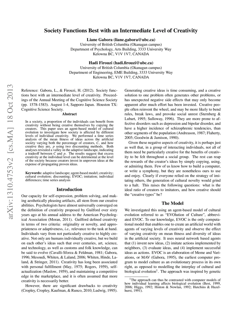 In a society, a proportion of the individuals can benefit from creativity without being creative themselves by copying the creators. This paper uses an agent-based model of cultural evolution to investigate how society is affected by different levels of individual creativity. We performed a time series analysis of the mean fitness of ideas across the artificial society varying both the percentage of creators, C, and how creative they are, p using two discounting methods. Both analyses revealed a valley in the adaptive landscape, indicating a tradeoff between C and p. The results suggest that excess creativity at the individual level can be detrimental at the level of the society because creators invest in unproven ideas at the expense of propagating proven ideas.