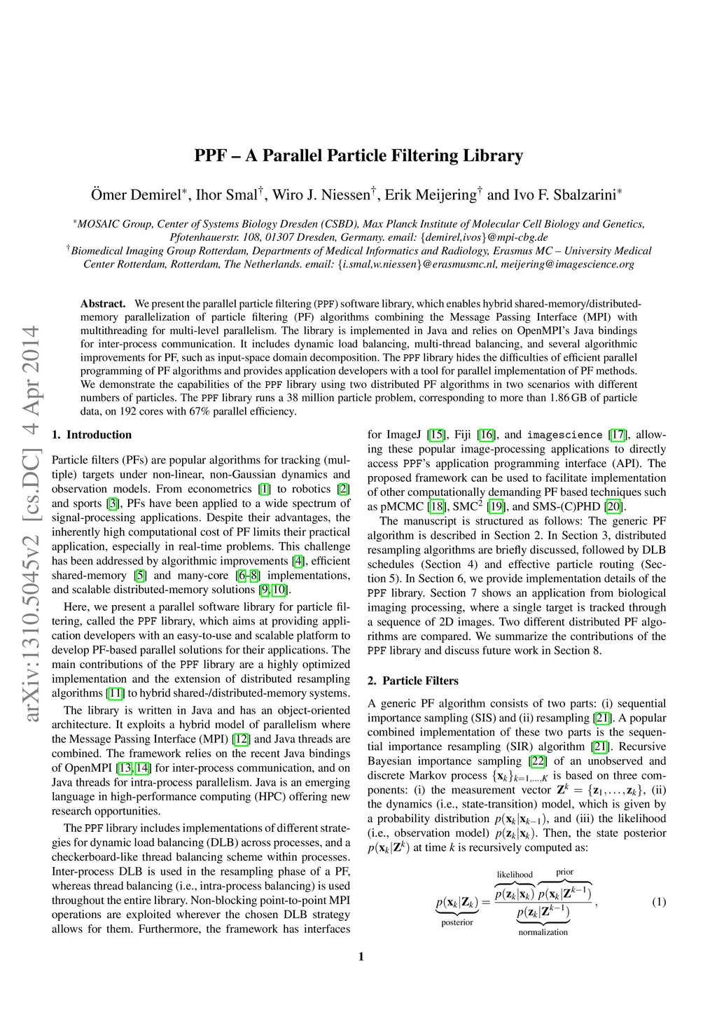 We present the parallel particle filtering (PPF) software library, which enables hybrid shared-memory/distributed-memory parallelization of particle filtering (PF) algorithms combining the Message Passing Interface (MPI) with multithreading for multi-level parallelism. The library is implemented in Java and relies on OpenMPI's Java bindings for inter-process communication. It includes dynamic load balancing, multi-thread balancing, and several algorithmic improvements for PF, such as input-space domain decomposition. The PPF library hides the difficulties of efficient parallel programming of PF algorithms and provides application developers with the necessary tools for parallel implementation of PF methods. We demonstrate the capabilities of the PPF library using two distributed PF algorithms in two scenarios with different numbers of particles. The PPF library runs a 38 million particle problem, corresponding to more than 1.86 TB of particle data, on 192 cores with 67% parallel efficiency. To the best of our knowledge, the PPF library is the first open-source software that offers a parallel framework for PF applications.