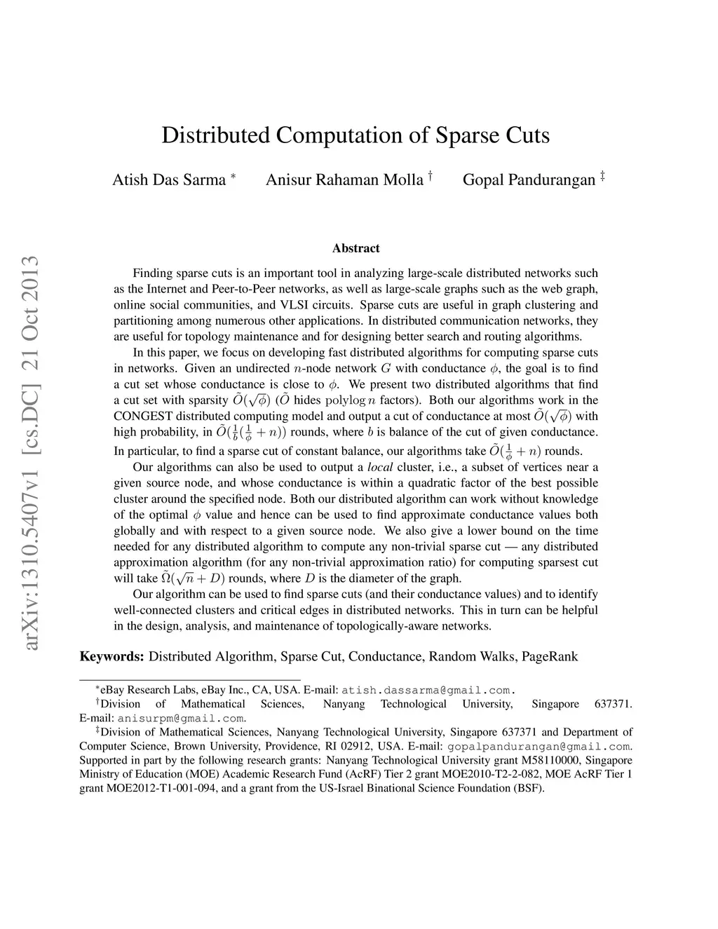 Finding sparse cuts is an important tool in analyzing large-scale distributed networks such as the Internet and Peer-to-Peer networks, as well as large-scale graphs such as the web graph, online social communities, and VLSI circuits. In distributed communication networks, they are useful for topology maintenance and for designing better search and routing algorithms. In this paper, we focus on developing fast distributed algorithms for computing sparse cuts in networks. Given an undirected -node network with conductance , the goal is to find a cut set whose conductance is close to . We present two distributed algorithms that find a cut set with sparsity ( hides factors). Both our algorithms work in the CONGEST distributed computing model and output a cut of conductance at most with high probability, in rounds, where is balance of the cut of given conductance. In particular, to find a sparse cut of constant balance, our algorithms take rounds. Our algorithms can also be used to output a {\em local} cluster, i.e., a subset of vertices near a given source node, and whose conductance is within a quadratic factor of the best possible cluster around the specified node. Both our distributed algorithm can work without knowledge of the optimal value and hence can be used to find approximate conductance values both globally and with respect to a given source node. We also give a lower bound on the time needed for any distributed algorithm to compute any non-trivial sparse cut --- any distributed approximation algorithm (for any non-trivial approximation ratio) for computing sparsest cut will take rounds, where is the diameter of the graph.