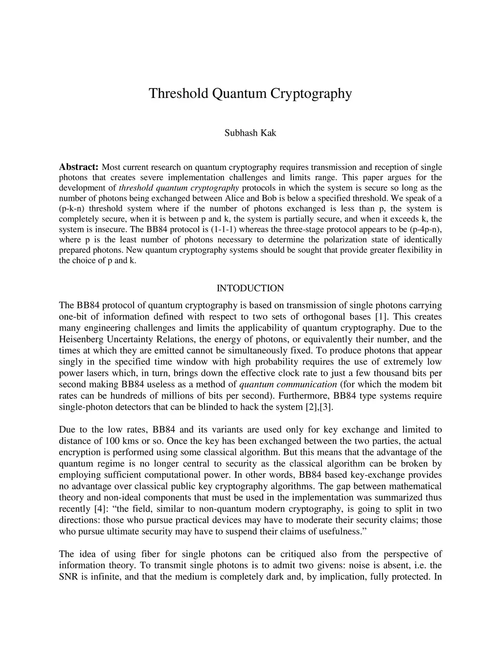 Most current research on quantum cryptography requires transmission and reception of single photons that creates severe implementation challenges and limits range. This paper argues for the development of threshold quantum cryptography protocols in which the system is secure so long as the number of photons being exchanged between Alice and Bob is below a specified threshold. We speak of a (p-k-n) threshold system where if the number of photons exchanged is less than p, the system is completely secure, when it is between p and k, the system is partially secure, and when it exceeds k, the system is insecure. The BB84 protocol is (1-1-1) whereas the three-stage protocol appears to be (p-4p-n), where p is the least number of photons necessary to determine the polarization state of identically prepared photons. New quantum cryptography systems should be sought that provide greater flexibility in the choice of p and k.
