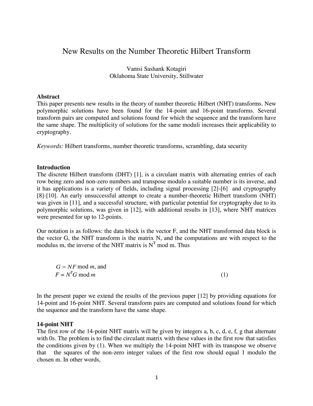 This paper presents new results in the theory of number theoretic Hilbert (NHT) transforms. New polymorphic solutions have been found for the 14-point and 16-point transforms. Several transform pairs are computed and solutions found for which the sequence and the transform have the same shape. The multiplicity of solutions for the same moduli increases their applicability to cryptography.