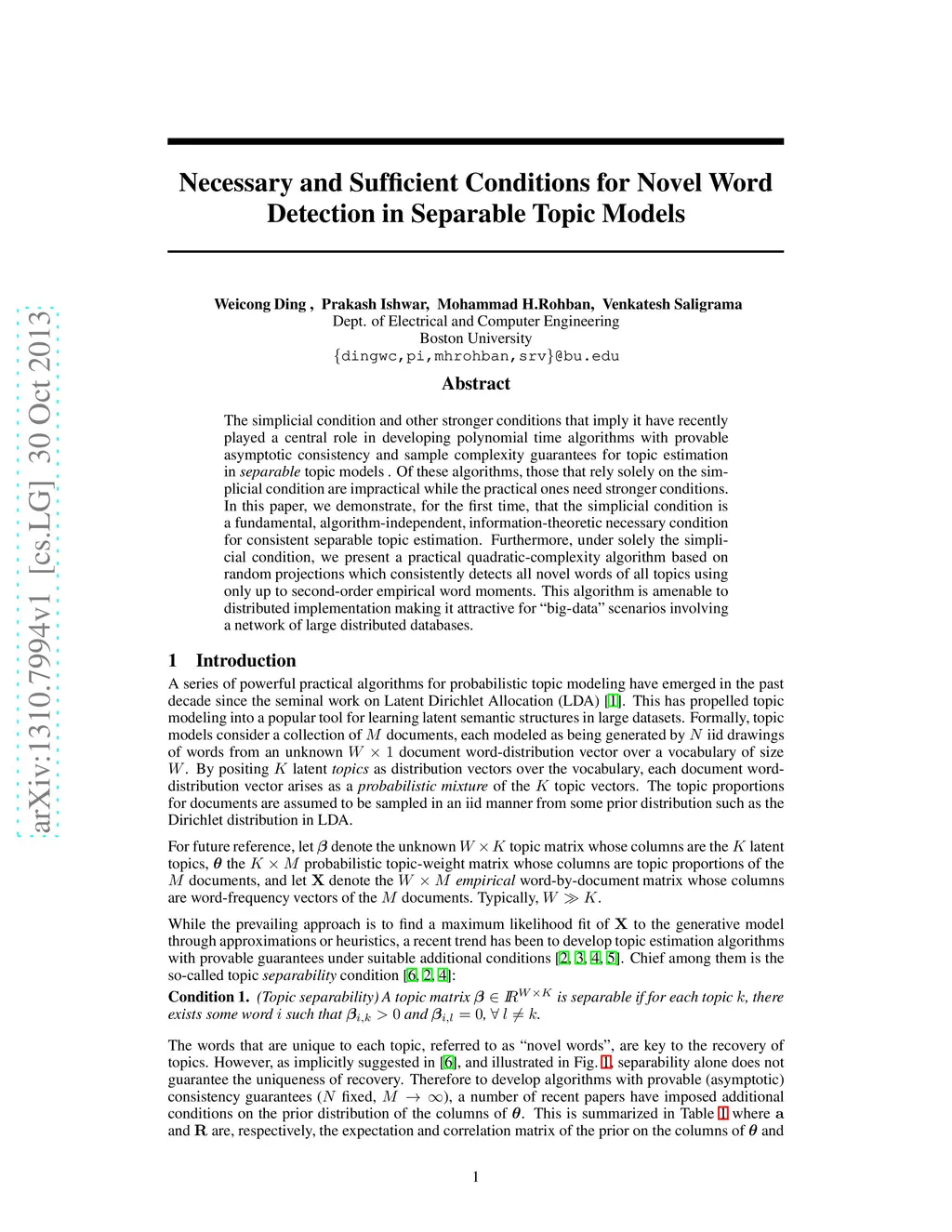The simplicial condition and other stronger conditions that imply it have recently played a central role in developing polynomial time algorithms with provable asymptotic consistency and sample complexity guarantees for topic estimation in separable topic models. Of these algorithms, those that rely solely on the simplicial condition are impractical while the practical ones need stronger conditions. In this paper, we demonstrate, for the first time, that the simplicial condition is a fundamental, algorithm-independent, information-theoretic necessary condition for consistent separable topic estimation. Furthermore, under solely the simplicial condition, we present a practical quadratic-complexity algorithm based on random projections which consistently detects all novel words of all topics using only up to second-order empirical word moments. This algorithm is amenable to distributed implementation making it attractive for 'big-data' scenarios involving a network of large distributed databases.