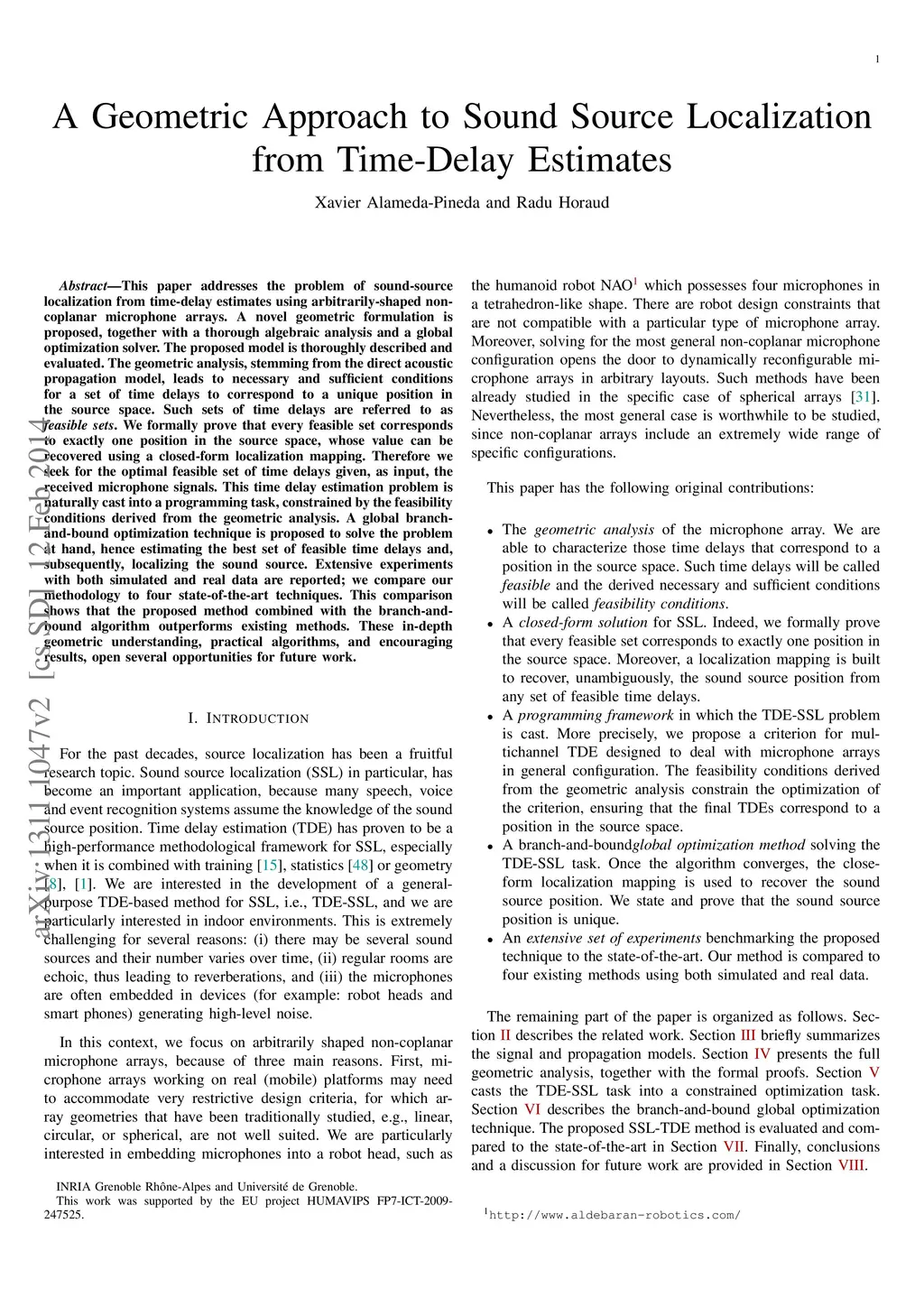 This paper addresses the problem of sound-source localization from time-delay estimates using arbitrarily-shaped non-coplanar microphone arrays. A novel geometric formulation is proposed, together with a thorough algebraic analysis and a global optimization solver. The proposed model is thoroughly described and evaluated. The geometric analysis, stemming from the direct acoustic propagation model, leads to necessary and sufficient conditions for a set of time delays to correspond to a unique position in the source space. Such sets of time delays are referred to as feasible sets. We formally prove that every feasible set corresponds to exactly one position in the source space, whose value can be recovered using a closed-form localization mapping. Therefore we seek for the optimal feasible set of time delays given, as input, the received microphone signals. This time delay estimation problem is naturally cast into a programming task, constrained by the feasibility conditions derived from the geometric analysis. A global branch-and-bound optimization technique is proposed to solve the problem at hand, hence estimating the best set of feasible time delays and, subsequently, localizing the sound source. Extensive experiments with both simulated and real data are reported; we compare our methodology to four state-of-the-art techniques. This comparison clearly shows that the proposed method combined with the branch-and-bound algorithm outperforms existing methods. These in-depth geometric understanding, practical algorithms, and encouraging results, open several opportunities for future work.
