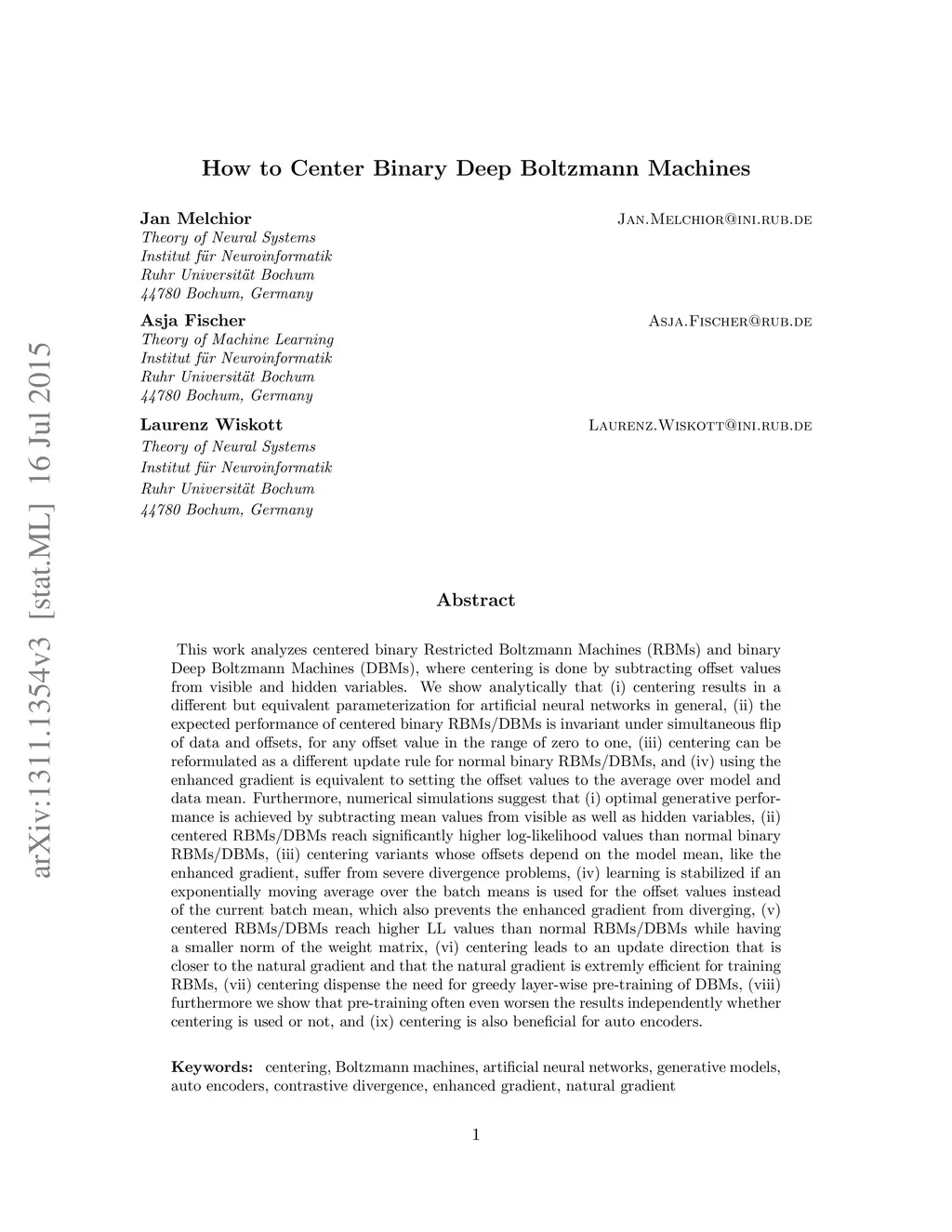 This work analyzes centered binary Restricted Boltzmann Machines (RBMs) and binary Deep Boltzmann Machines (DBMs), where centering is done by subtracting offset values from visible and hidden variables. We show analytically that (i) centering results in a different but equivalent parameterization for artificial neural networks in general, (ii) the expected performance of centered binary RBMs/DBMs is invariant under simultaneous flip of data and offsets, for any offset value in the range of zero to one, (iii) centering can be reformulated as a different update rule for normal binary RBMs/DBMs, and (iv) using the enhanced gradient is equivalent to setting the offset values to the average over model and data mean. Furthermore, numerical simulations suggest that (i) optimal generative performance is achieved by subtracting mean values from visible as well as hidden variables, (ii) centered RBMs/DBMs reach significantly higher log-likelihood values than normal binary RBMs/DBMs, (iii) centering variants whose offsets depend on the model mean, like the enhanced gradient, suffer from severe divergence problems, (iv) learning is stabilized if an exponentially moving average over the batch means is used for the offset values instead of the current batch mean, which also prevents the enhanced gradient from diverging, (v) centered RBMs/DBMs reach higher LL values than normal RBMs/DBMs while having a smaller norm of the weight matrix, (vi) centering leads to an update direction that is closer to the natural gradient and that the natural gradient is extremly efficient for training RBMs, (vii) centering dispense the need for greedy layer-wise pre-training of DBMs, (viii) furthermore we show that pre-training often even worsen the results independently whether centering is used or not, and (ix) centering is also beneficial for auto encoders.