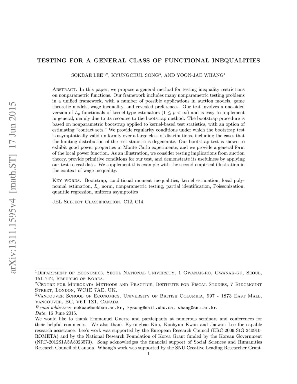 In this paper, we propose a general method for testing inequality restrictions on nonparametric functions. Our framework includes many nonparametric testing problems in a unified framework, with a number of possible applications in auction models, game theoretic models, wage inequality, and revealed preferences. Our test involves a one-sided version of functionals of kernel-type estimators and is easy to implement in general, mainly due to its recourse to the bootstrap method. The bootstrap procedure is based on nonparametric bootstrap applied to kernel-based test statistics, with estimated "contact sets." We provide regularity conditions under which the bootstrap test is asymptotically valid uniformly over a large class of distributions, including the cases that the limiting distribution of the test statistic is degenerate. Our bootstrap test is shown to exhibit good power properties in Monte Carlo experiments, and we provide a general form of the local power function. As an illustration, we consider testing implications from auction theory, provide primitive conditions for our test, and demonstrate its usefulness by applying our test to real data. We supplement this example with the second empirical illustration in the context of wage inequality.