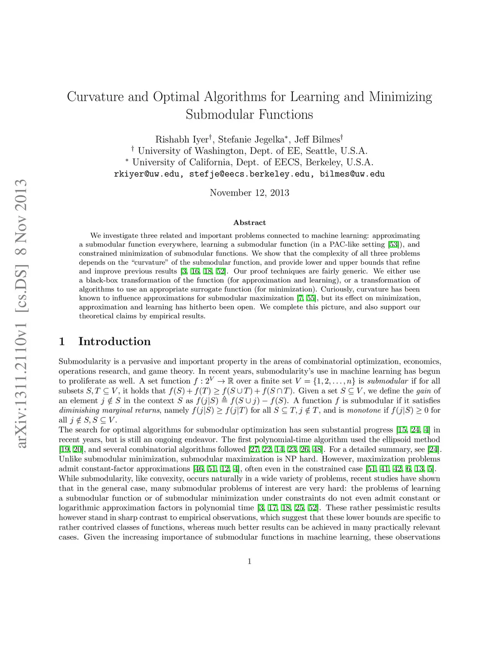 We investigate three related and important problems connected to machine learning: approximating a submodular function everywhere, learning a submodular function (in a PAC-like setting [53]), and constrained minimization of submodular functions. We show that the complexity of all three problems depends on the 'curvature' of the submodular function, and provide lower and upper bounds that refine and improve previous results [3, 16, 18, 52]. Our proof techniques are fairly generic. We either use a black-box transformation of the function (for approximation and learning), or a transformation of algorithms to use an appropriate surrogate function (for minimization). Curiously, curvature has been known to influence approximations for submodular maximization [7, 55], but its effect on minimization, approximation and learning has hitherto been open. We complete this picture, and also support our theoretical claims by empirical results.