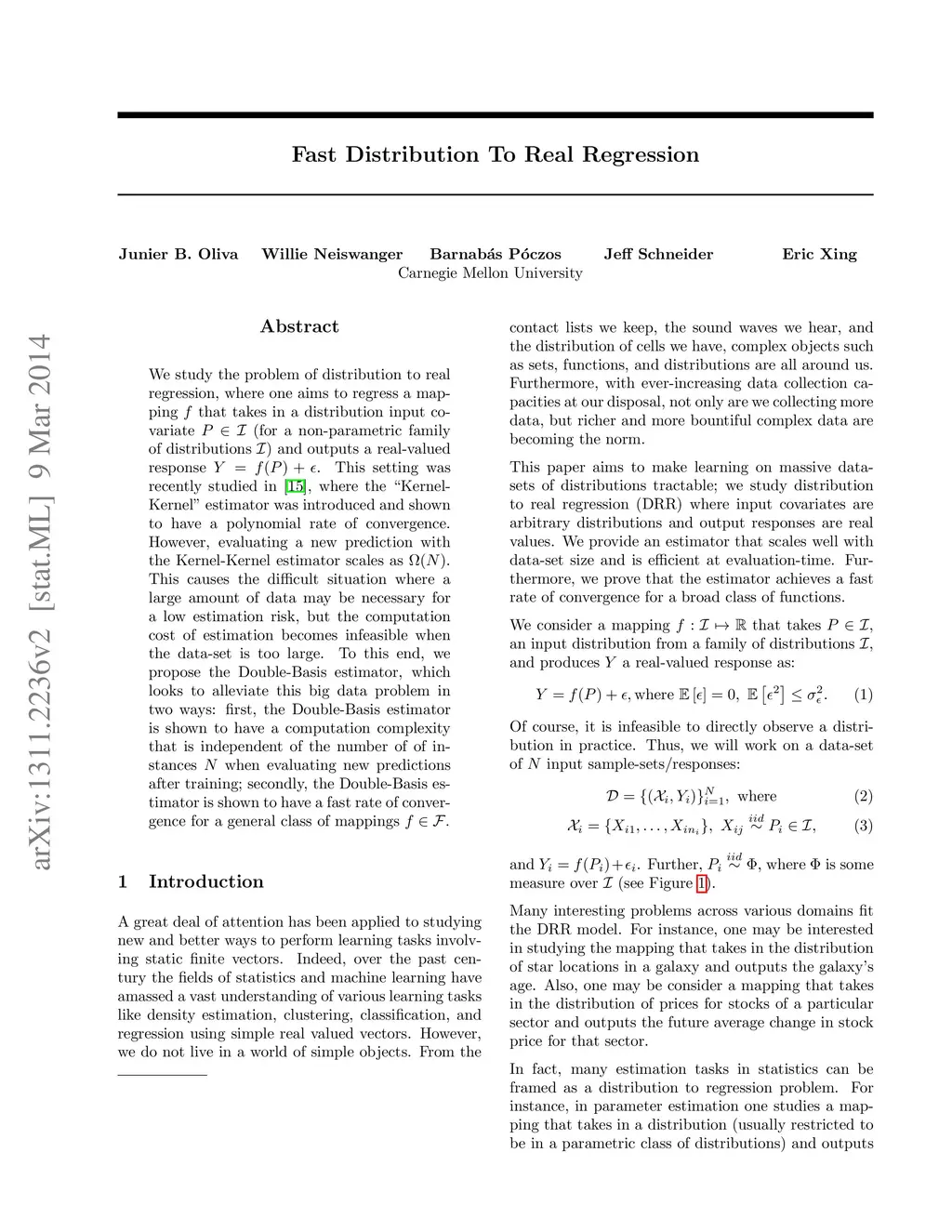 We study the problem of distribution to real-value regression, where one aims to regress a mapping that takes in a distribution input covariate (for a non-parametric family of distributions ) and outputs a real-valued response . This setting was recently studied, and a "Kernel-Kernel" estimator was introduced and shown to have a polynomial rate of convergence. However, evaluating a new prediction with the Kernel-Kernel estimator scales as . This causes the difficult situation where a large amount of data may be necessary for a low estimation risk, but the computation cost of estimation becomes unfeasible when the data-set is too large. To this end, we propose the Double-Basis estimator, which looks to alleviate this big data problem in two ways: first, the Double-Basis estimator is shown to have a computation complexity that is independent of the number of of instances when evaluating new predictions after training; secondly, the Double-Basis estimator is shown to have a fast rate of convergence for a general class of mappings .