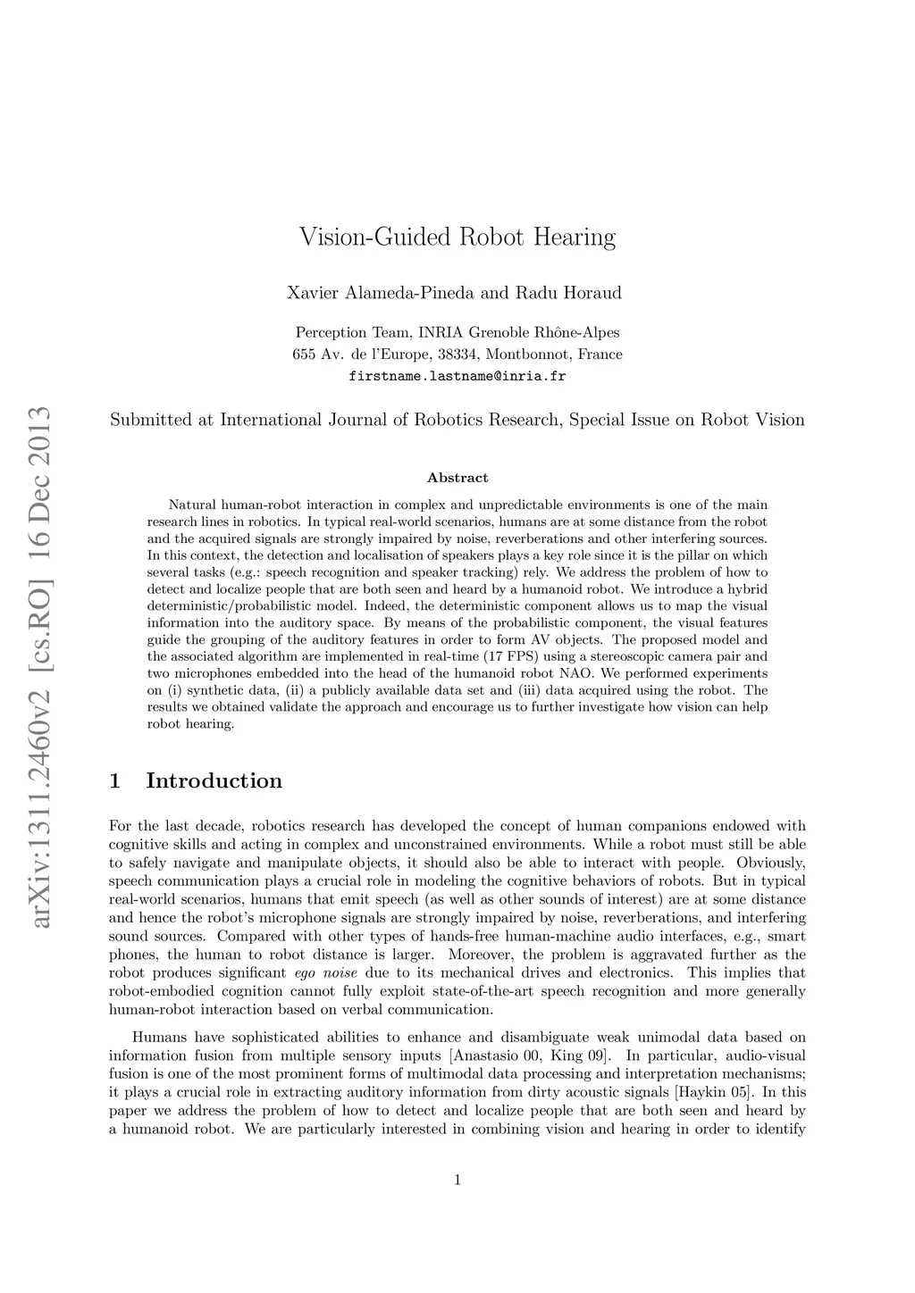Natural human-robot interaction in complex and unpredictable environments is one of the main research lines in robotics. In typical real-world scenarios, humans are at some distance from the robot and the acquired signals are strongly impaired by noise, reverberations and other interfering sources. In this context, the detection and localisation of speakers plays a key role since it is the pillar on which several tasks (e.g.: speech recognition and speaker tracking) rely. We address the problem of how to detect and localize people that are both seen and heard by a humanoid robot. We introduce a hybrid deterministic/probabilistic model. Indeed, the deterministic component allows us to map the visual information into the auditory space. By means of the probabilistic component, the visual features guide the grouping of the auditory features in order to form AV objects. The proposed model and the associated algorithm are implemented in real-time (17 FPS) using a stereoscopic camera pair and two microphones embedded into the head of the humanoid robot NAO. We performed experiments on (i) synthetic data, (ii) a publicly available data set and (iii) data acquired using the robot. The results we obtained validate the approach and encourage us to further investigate how vision can help robot hearing.
