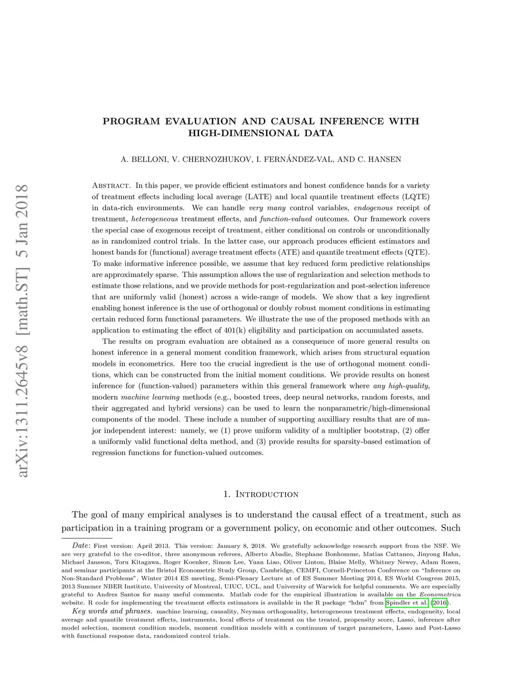 Program Evaluation and Causal Inference with High-Dimensional Data