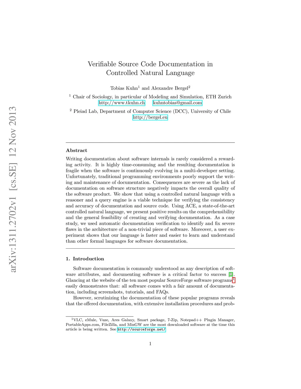 Writing documentation about software internals is rarely considered a rewarding activity. It is highly time-consuming and the resulting documentation is fragile when the software is continuously evolving in a multi-developer setting. Unfortunately, traditional programming environments poorly support the writing and maintenance of documentation. Consequences are severe as the lack of documentation on software structure negatively impacts the overall quality of the software product. We show that using a controlled natural language with a reasoner and a query engine is a viable technique for verifying the consistency and accuracy of documentation and source code. Using ACE, a state-of-the-art controlled natural language, we present positive results on the comprehensibility and the general feasibility of creating and verifying documentation. As a case study, we used automatic documentation verification to identify and fix severe flaws in the architecture of a non-trivial piece of software. Moreover, a user experiment shows that our language is faster and easier to learn and understand than other formal languages for software documentation.