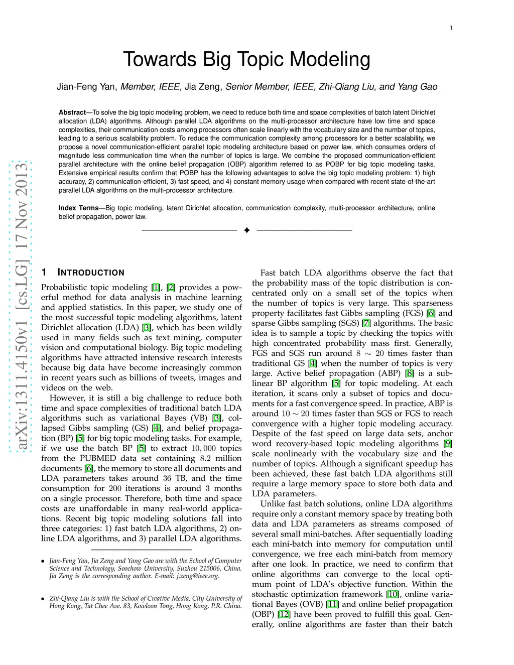To solve the big topic modeling problem, we need to reduce both time and space complexities of batch latent Dirichlet allocation (LDA) algorithms. Although parallel LDA algorithms on the multi-processor architecture have low time and space complexities, their communication costs among processors often scale linearly with the vocabulary size and the number of topics, leading to a serious scalability problem. To reduce the communication complexity among processors for a better scalability, we propose a novel communication-efficient parallel topic modeling architecture based on power law, which consumes orders of magnitude less communication time when the number of topics is large. We combine the proposed communication-efficient parallel architecture with the online belief propagation (OBP) algorithm referred to as POBP for big topic modeling tasks. Extensive empirical results confirm that POBP has the following advantages to solve the big topic modeling problem: 1) high accuracy, 2) communication-efficient, 3) fast speed, and 4) constant memory usage when compared with recent state-of-the-art parallel LDA algorithms on the multi-processor architecture.