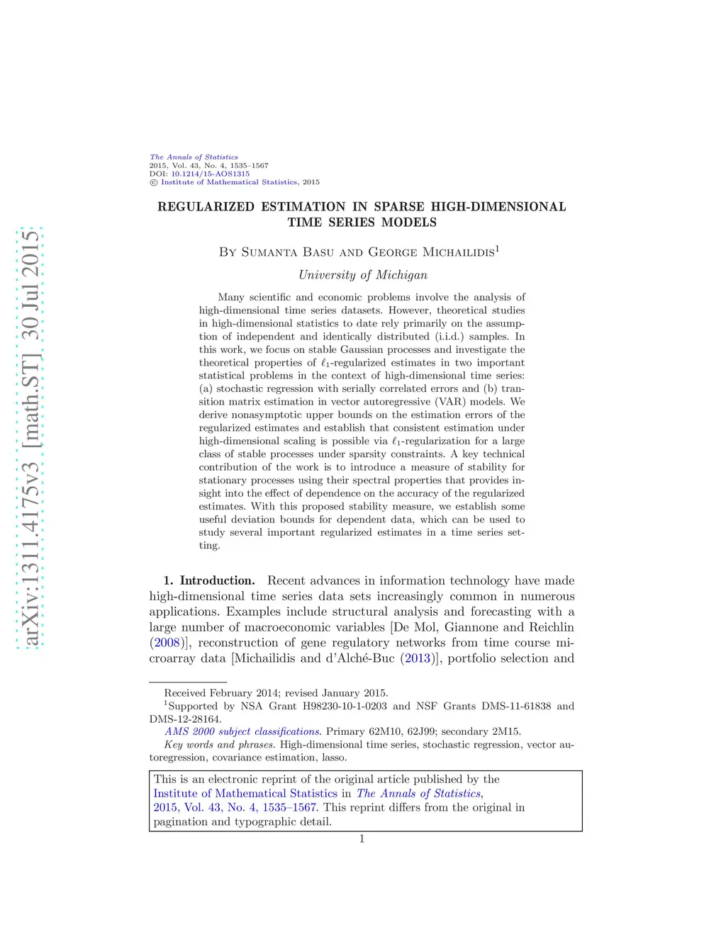 Many scientific and economic problems involve the analysis of high-dimensional time series datasets. However, theoretical studies in high-dimensional statistics to date rely primarily on the assumption of independent and identically distributed (i.i.d.) samples. In this work, we focus on stable Gaussian processes and investigate the theoretical properties of -regularized estimates in two important statistical problems in the context of high-dimensional time series: (a) stochastic regression with serially correlated errors and (b) transition matrix estimation in vector autoregressive (VAR) models. We derive nonasymptotic upper bounds on the estimation errors of the regularized estimates and establish that consistent estimation under high-dimensional scaling is possible via -regularization for a large class of stable processes under sparsity constraints. A key technical contribution of the work is to introduce a measure of stability for stationary processes using their spectral properties that provides insight into the effect of dependence on the accuracy of the regularized estimates. With this proposed stability measure, we establish some useful deviation bounds for dependent data, which can be used to study several important regularized estimates in a time series setting.