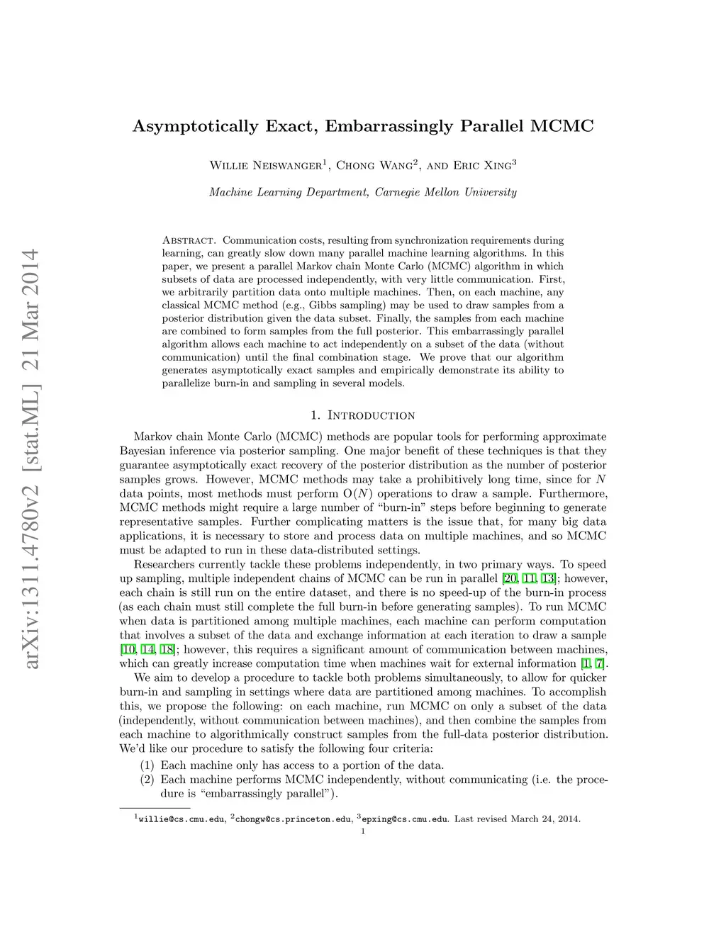 Communication costs, resulting from synchronization requirements during learning, can greatly slow down many parallel machine learning algorithms. In this paper, we present a parallel Markov chain Monte Carlo (MCMC) algorithm in which subsets of data are processed independently, with very little communication. First, we arbitrarily partition data onto multiple machines. Then, on each machine, any classical MCMC method (e.g., Gibbs sampling) may be used to draw samples from a posterior distribution given the data subset. Finally, the samples from each machine are combined to form samples from the full posterior. This embarrassingly parallel algorithm allows each machine to act independently on a subset of the data (without communication) until the final combination stage. We prove that our algorithm generates asymptotically exact samples and empirically demonstrate its ability to parallelize burn-in and sampling in several models.