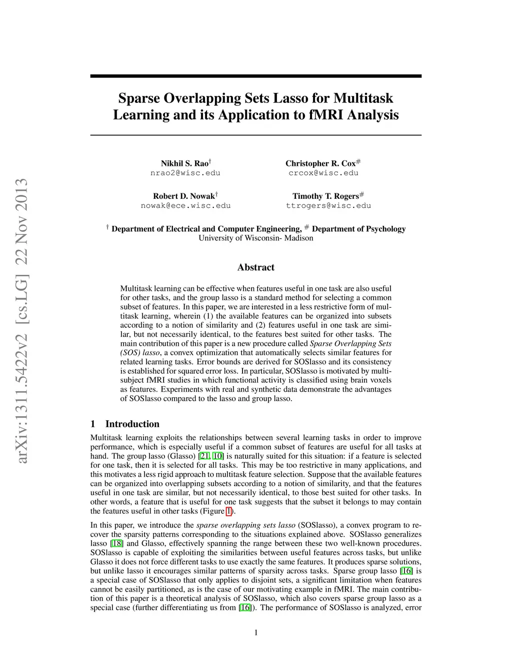 Multitask learning can be effective when features useful in one task are also useful for other tasks, and the group lasso is a standard method for selecting a common subset of features. In this paper, we are interested in a less restrictive form of multitask learning, wherein (1) the available features can be organized into subsets according to a notion of similarity and (2) features useful in one task are similar, but not necessarily identical, to the features best suited for other tasks. The main contribution of this paper is a new procedure called Sparse Overlapping Sets (SOS) lasso, a convex optimization that automatically selects similar features for related learning tasks. Error bounds are derived for SOSlasso and its consistency is established for squared error loss. In particular, SOSlasso is motivated by multi- subject fMRI studies in which functional activity is classified using brain voxels as features. Experiments with real and synthetic data demonstrate the advantages of SOSlasso compared to the lasso and group lasso.