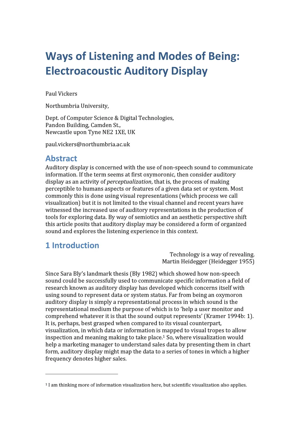 Ways of Listening and Modes of Being: Electroacoustic Auditory Display