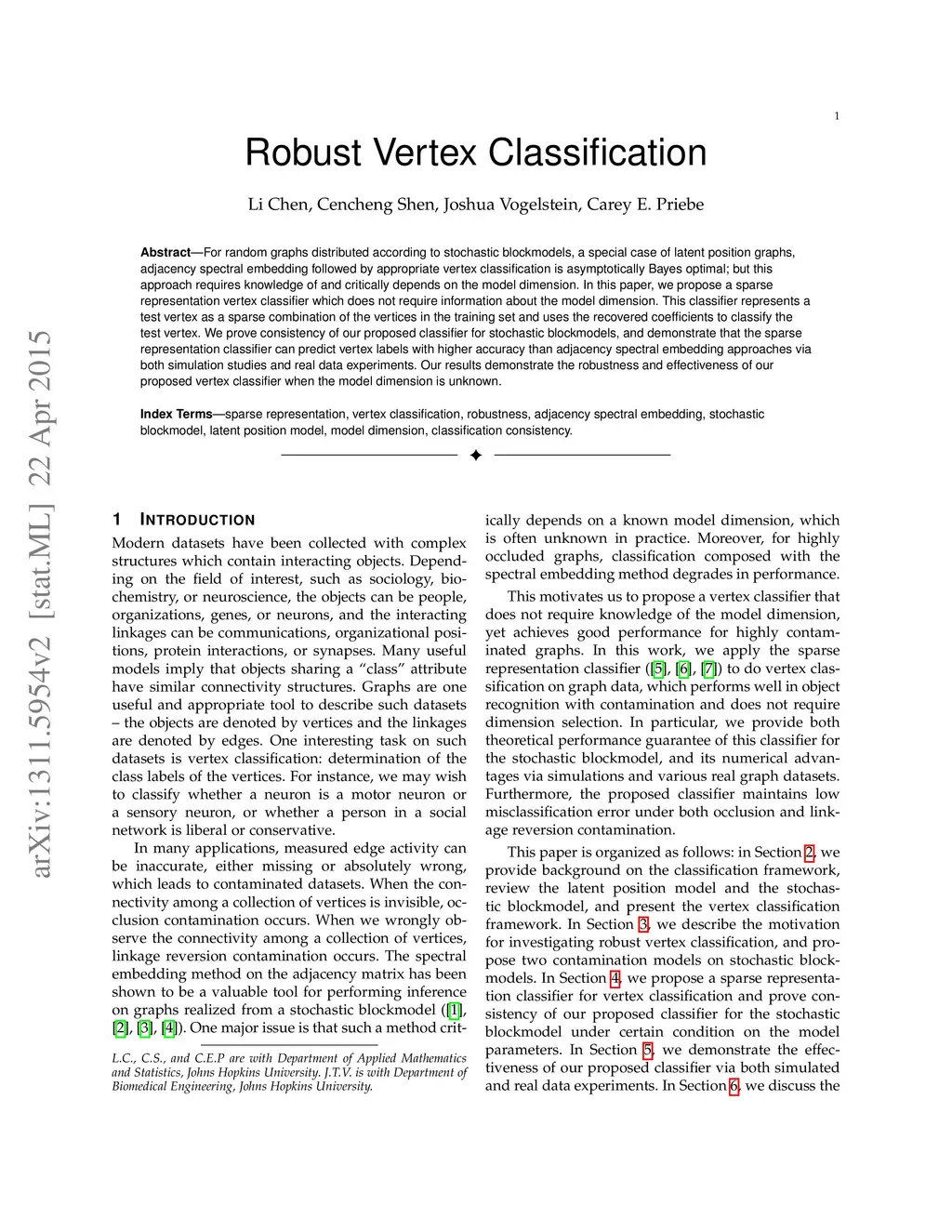 For random graphs distributed according to stochastic blockmodels, a special case of latent position graphs, adjacency spectral embedding followed by appropriate vertex classification is asymptotically Bayes optimal; but this approach requires knowledge of and critically depends on the model dimension. In this paper, we propose a sparse representation vertex classifier which does not require information about the model dimension. This classifier represents a test vertex as a sparse combination of the vertices in the training set and uses the recovered coefficients to classify the test vertex. We prove consistency of our proposed classifier for stochastic blockmodels, and demonstrate that the sparse representation classifier can predict vertex labels with higher accuracy than adjacency spectral embedding approaches via both simulation studies and real data experiments. Our results demonstrate the robustness and effectiveness of our proposed vertex classifier when the model dimension is unknown.