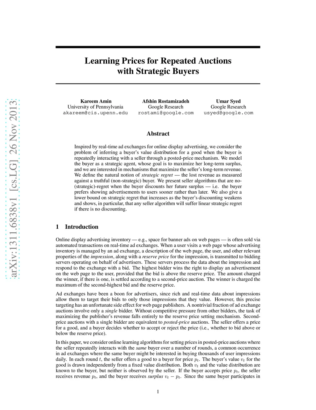 Inspired by real-time ad exchanges for online display advertising, we consider the problem of inferring a buyer's value distribution for a good when the buyer is repeatedly interacting with a seller through a posted-price mechanism. We model the buyer as a strategic agent, whose goal is to maximize her long-term surplus, and we are interested in mechanisms that maximize the seller's long-term revenue. We define the natural notion of strategic regret --- the lost revenue as measured against a truthful (non-strategic) buyer. We present seller algorithms that are no-(strategic)-regret when the buyer discounts her future surplus --- i.e. the buyer prefers showing advertisements to users sooner rather than later. We also give a lower bound on strategic regret that increases as the buyer's discounting weakens and shows, in particular, that any seller algorithm will suffer linear strategic regret if there is no discounting.
