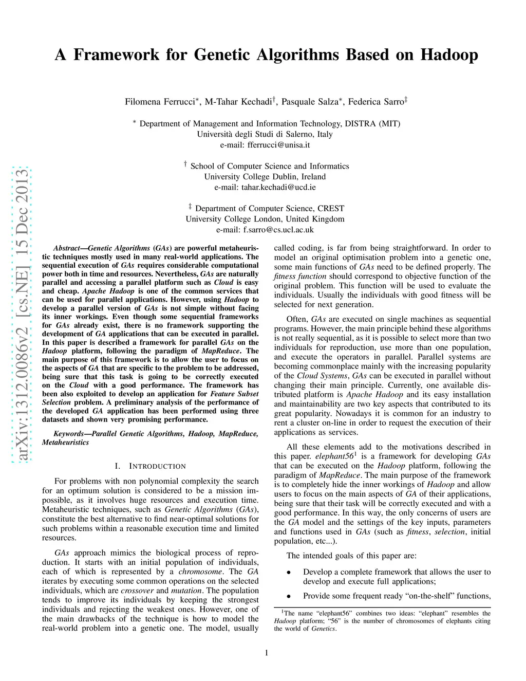 Genetic Algorithms (GAs) are powerful metaheuristic techniques mostly used in many real-world applications. The sequential execution of GAs requires considerable computational power both in time and resources. Nevertheless, GAs are naturally parallel and accessing a parallel platform such as Cloud is easy and cheap. Apache Hadoop is one of the common services that can be used for parallel applications. However, using Hadoop to develop a parallel version of GAs is not simple without facing its inner workings. Even though some sequential frameworks for GAs already exist, there is no framework supporting the development of GA applications that can be executed in parallel. In this paper is described a framework for parallel GAs on the Hadoop platform, following the paradigm of MapReduce. The main purpose of this framework is to allow the user to focus on the aspects of GA that are specific to the problem to be addressed, being sure that this task is going to be correctly executed on the Cloud with a good performance. The framework has been also exploited to develop an application for Feature Subset Selection problem. A preliminary analysis of the performance of the developed GA application has been performed using three datasets and shown very promising performance.