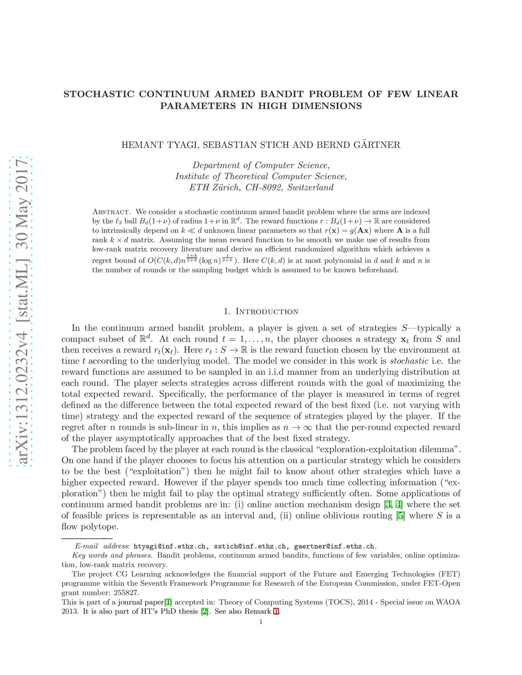 We consider a stochastic continuum armed bandit problem where the arms are indexed by the ball of radius in . The reward functions are considered to intrinsically depend on unknown linear parameters so that where is a full rank matrix. Assuming the mean reward function to be smooth we make use of results from low-rank matrix recovery literature and derive an efficient randomized algorithm which achieves a regret bound of with high probability. Here is at most polynomial in and and is the number of rounds or the sampling budget which is assumed to be known beforehand.