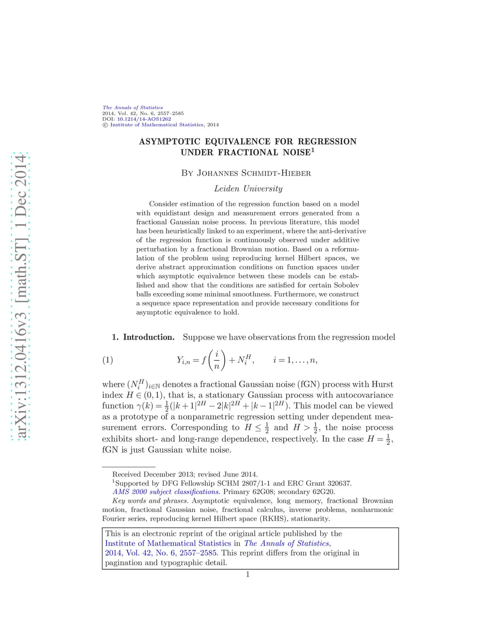 Consider estimation of the regression function based on a model with equidistant design and measurement errors generated from a fractional Gaussian noise process. In previous literature, this model has been heuristically linked to an experiment, where the anti-derivative of the regression function is continuously observed under additive perturbation by a fractional Brownian motion. Based on a reformulation of the problem using reproducing kernel Hilbert spaces, we derive abstract approximation conditions on function spaces under which asymptotic equivalence between these models can be established and show that the conditions are satisfied for certain Sobolev balls exceeding some minimal smoothness. Furthermore, we construct a sequence space representation and provide necessary conditions for asymptotic equivalence to hold.