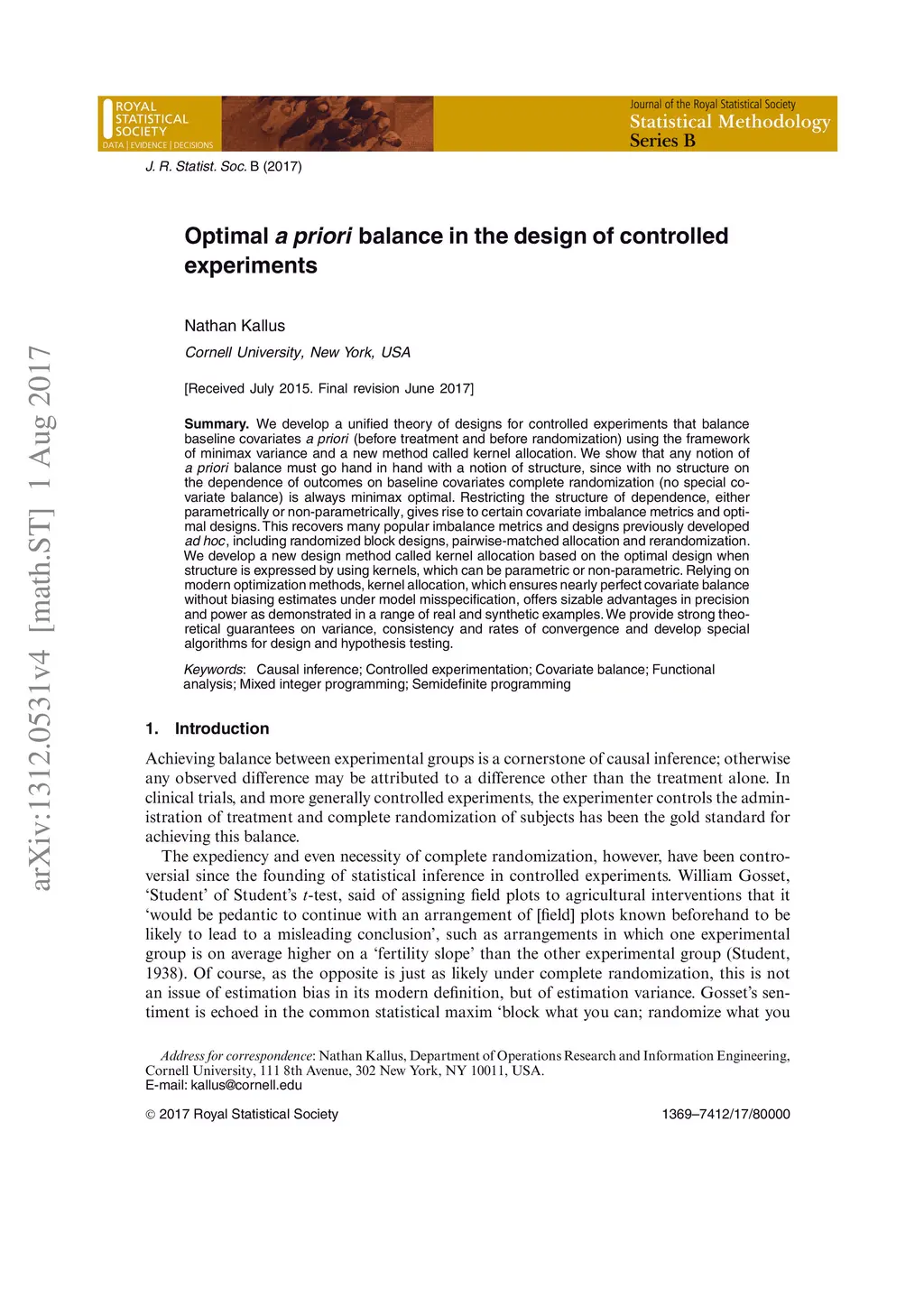 We develop a unified theory of designs for controlled experiments that balance baseline covariates a priori (before treatment and before randomization) using the framework of minimax variance and a new method called kernel allocation. We show that any notion of a priori balance must go hand in hand with a notion of structure, since with no structure on the dependence of outcomes on baseline covariates complete randomization (no special covariate balance) is always minimax optimal. Restricting the structure of dependence, either parametrically or non-parametrically, gives rise to certain covariate imbalance metrics and optimal designs. This recovers many popular imbalance metrics and designs previously developed ad hoc, including randomized block designs, pairwise-matched allocation and rerandomization. We develop a new design method called kernel allocation based on the optimal design when structure is expressed by using kernels, which can be parametric or non-parametric. Relying on modern optimization methods, kernel allocation, which ensures nearly perfect covariate balance without biasing estimates under model misspecification, offers sizable advantages in precision and power as demonstrated in a range of real and synthetic examples. We provide strong theoretical guarantees on variance, consistency and rates of convergence and develop special algorithms for design and hypothesis testing.