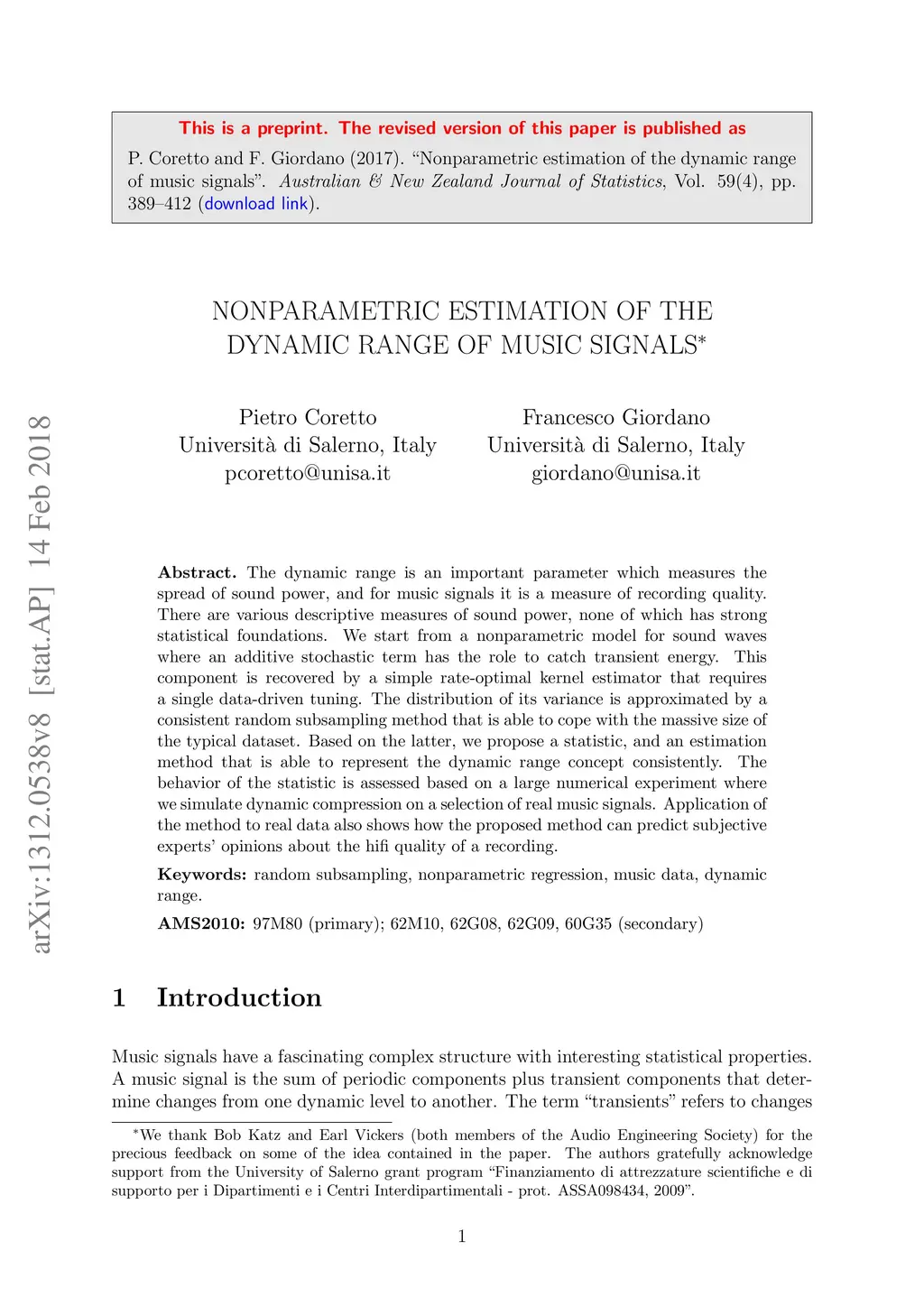 The dynamic range is an important parameter which measures the spread of sound power, and for music signals it is a measure of recording quality. There are various descriptive measures of sound power, none of which has strong statistical foundations. We start from a nonparametric model for sound waves where an additive stochastic term has the role to catch transient energy. This component is recovered by a simple rate-optimal kernel estimator that requires a single data-driven tuning. The distribution of its variance is approximated by a consistent random subsampling method that is able to cope with the massive size of the typical dataset. Based on the latter, we propose a statistic, and an estimation method that is able to represent the dynamic range concept consistently. The behavior of the statistic is assessed based on a large numerical experiment where we simulate dynamic compression on a selection of real music signals. Application of the method to real data also shows how the proposed method can predict subjective experts' opinions about the hifi quality of a recording.