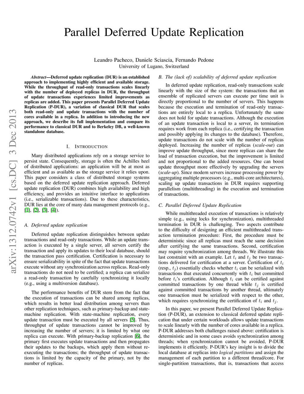 Deferred update replication (DUR) is an established approach to implementing highly efficient and available storage. While the throughput of read-only transactions scales linearly with the number of deployed replicas in DUR, the throughput of update transactions experiences limited improvements as replicas are added. This paper presents Parallel Deferred Update Replication (P-DUR), a variation of classical DUR that scales both read-only and update transactions with the number of cores available in a replica. In addition to introducing the new approach, we describe its full implementation and compare its performance to classical DUR and to Berkeley DB, a well-known standalone database.