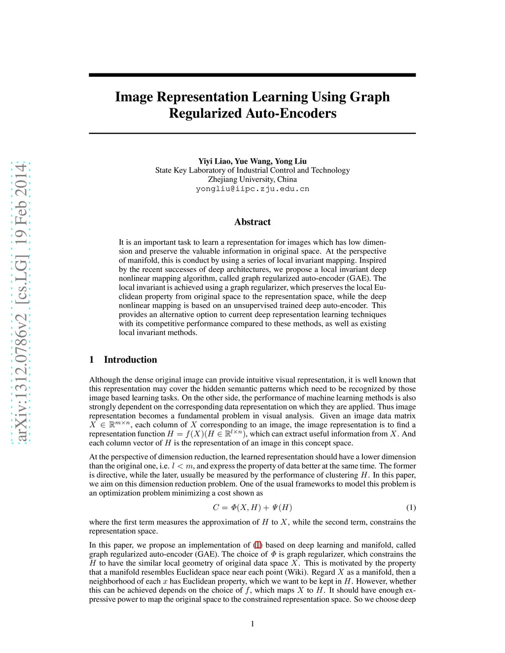 We consider the problem of image representation for the tasks of unsupervised learning and semi-supervised learning. In those learning tasks, the raw image vectors may not provide enough representation for their intrinsic structures due to their highly dense feature space. To overcome this problem, the raw image vectors should be mapped to a proper representation space which can capture the latent structure of the original data and represent the data explicitly for further learning tasks such as clustering. Inspired by the recent research works on deep neural network and representation learning, in this paper, we introduce the multiple-layer auto-encoder into image representation, we also apply the locally invariant ideal to our image representation with auto-encoders and propose a novel method, called Graph regularized Auto-Encoder (GAE). GAE can provide a compact representation which uncovers the hidden semantics and simultaneously respects the intrinsic geometric structure. Extensive experiments on image clustering show encouraging results of the proposed algorithm in comparison to the state-of-the-art algorithms on real-word cases.