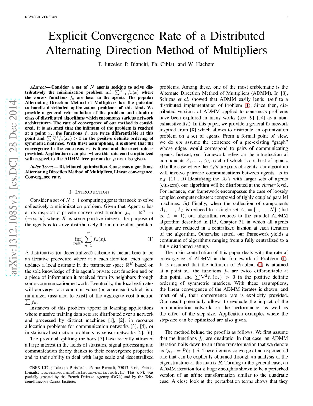 Consider a set of N agents seeking to solve distributively the minimization problem where the convex functions are local to the agents. The popular Alternating Direction Method of Multipliers has the potential to handle distributed optimization problems of this kind. We provide a general reformulation of the problem and obtain a class of distributed algorithms which encompass various network architectures. The rate of convergence of our method is considered. It is assumed that the infimum of the problem is reached at a point , the functions are twice differentiable at this point and in the positive definite ordering of symmetric matrices. With these assumptions, it is shown that the convergence to the consensus is linear and the exact rate is provided. Application examples where this rate can be optimized with respect to the ADMM free parameter are also given.