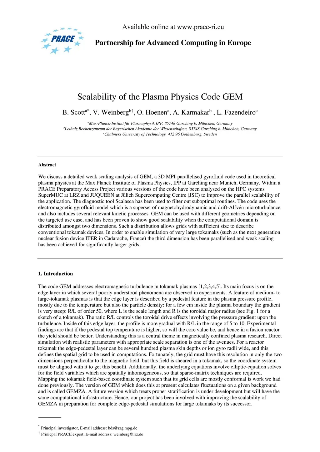 We discuss a detailed weak scaling analysis of GEM, a 3D MPI-parallelised gyrofluid code used in theoretical plasma physics at the Max Planck Institute of Plasma Physics, IPP at Garching b. M\"unchen, Germany. Within a PRACE Preparatory Access Project various versions of the code have been analysed on the HPC systems SuperMUC at LRZ and JUQUEEN at J\"ulich Supercomputing Centre (JSC) to improve the parallel scalability of the application. The diagnostic tool Scalasca has been used to filter out suboptimal routines. The code uses the electromagnetic gyrofluid model which is a superset of magnetohydrodynamic and drift-Alfv\én microturbulance and also includes several relevant kinetic processes. GEM can be used with different geometries depending on the targeted use case, and has been proven to show good scalability when the computational domain is distributed amongst two dimensions. Such a distribution allows grids with sufficient size to describe small scale tokamak devices. In order to enable simulation of very large tokamaks (such as the next generation nuclear fusion device ITER in Cadarache, France) the third dimension has been parallelised and weak scaling has been achieved for significantly larger grids.