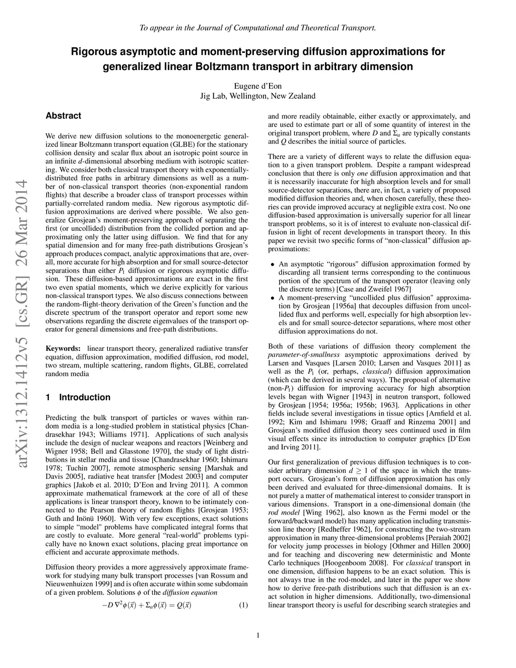 We derive new diffusion solutions to the monoenergetic generalized linear Boltzmann transport equation (GLBE) for the stationary collision density and scalar flux about an isotropic point source in an infinite -dimensional absorbing medium with isotropic scattering. We consider both classical transport theory with exponentially-distributed free paths in arbitrary dimensions as well as a number of non-classical transport theories (non-exponential random flights) that describe a broader class of transport processes within partially-correlated random media. New rigorous asymptotic diffusion approximations are derived where possible. We also generalize Grosjean's moment-preserving approach of separating the first (or uncollided) distribution from the collided portion and approximating only the latter using diffusion. We find that for any spatial dimension and for many free-path distributions Grosjean's approach produces compact, analytic approximations that are, overall, more accurate for high absorption and for small source-detector separations than either diffusion or rigorous asymptotic diffusion. These diffusion-based approximations are exact in the first two even spatial moments, which we derive explicitly for various non-classical transport types. We also discuss connections between the random-flight-theory derivation of the Green's function and the discrete spectrum of the transport operator and report some new observations regarding the discrete eigenvalues of the transport operator for general dimensions and free-path distributions.