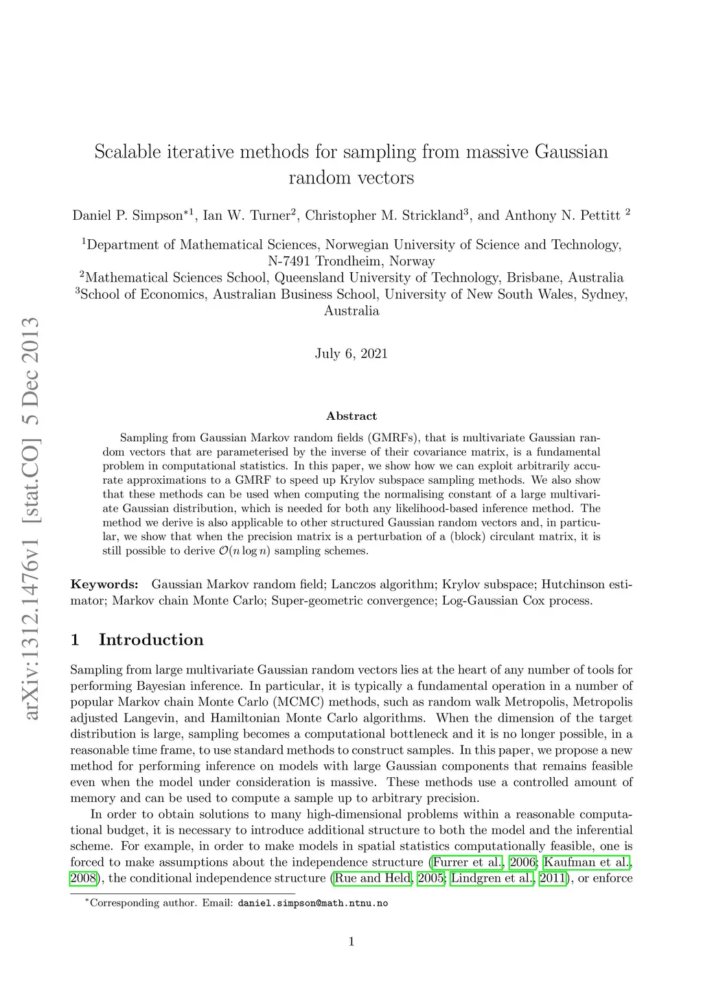 Sampling from Gaussian Markov random fields (GMRFs), that is multivariate Gaussian ran- dom vectors that are parameterised by the inverse of their covariance matrix, is a fundamental problem in computational statistics. In this paper, we show how we can exploit arbitrarily accu- rate approximations to a GMRF to speed up Krylov subspace sampling methods. We also show that these methods can be used when computing the normalising constant of a large multivariate Gaussian distribution, which is needed for both any likelihood-based inference method. The method we derive is also applicable to other structured Gaussian random vectors and, in particu- lar, we show that when the precision matrix is a perturbation of a (block) circulant matrix, it is still possible to derive O(n log n) sampling schemes.