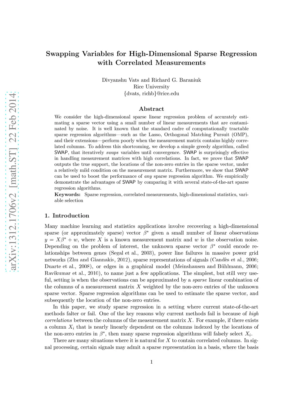 We consider the high-dimensional sparse linear regression problem of accurately estimating a sparse vector using a small number of linear measurements that are contaminated by noise. It is well known that the standard cadre of computationally tractable sparse regression algorithms---such as the Lasso, Orthogonal Matching Pursuit (OMP), and their extensions---perform poorly when the measurement matrix contains highly correlated columns. To address this shortcoming, we develop a simple greedy algorithm, called SWAP, that iteratively swaps variables until convergence. SWAP is surprisingly effective in handling measurement matrices with high correlations. In fact, we prove that SWAP outputs the true support, the locations of the non-zero entries in the sparse vector, under a relatively mild condition on the measurement matrix. Furthermore, we show that SWAP can be used to boost the performance of any sparse regression algorithm. We empirically demonstrate the advantages of SWAP by comparing it with several state-of-the-art sparse regression algorithms.