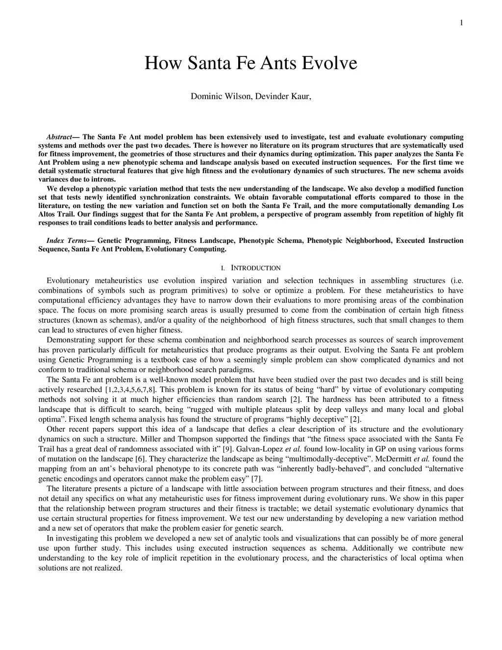 The Santa Fe Ant model problem has been extensively used to investigate, test and evaluate Evolutionary Computing systems and methods over the past two decades. There is however no literature on its program structures that are systematically used for fitness improvement, the geometries of those structures and their dynamics during optimization. This paper analyzes the Santa Fe Ant Problem using a new phenotypic schema and landscape analysis based on executed instruction sequences. For the first time we detail systematic structural features that give high fitness and the evolutionary dynamics of such structures. The new schema avoids variances due to introns. We develop a phenotypic variation method that tests the new understanding of the landscape. We also develop a modified function set that tests newly identified synchronization constraints. We obtain favorable computational efforts compared to those in the literature, on testing the new variation and function set on both the Santa Fe Trail, and the more computationally demanding Los Altos Trail. Our findings suggest that for the Santa Fe Ant problem, a perspective of program assembly from repetition of highly fit responses to trail conditions leads to better analysis and performance.
