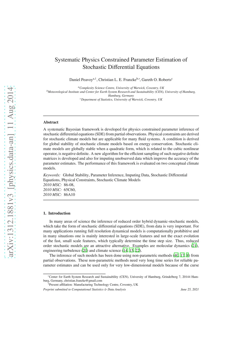 A systematic Bayesian framework is developed for physics constrained parameter inference ofstochastic differential equations (SDE) from partial observations. The physical constraints arederived for stochastic climate models but are applicable for many fluid systems. A condition isderived for global stability of stochastic climate models based on energy conservation. Stochasticclimate models are globally stable when a quadratic form, which is related to the cubic nonlinearoperator, is negative definite. A new algorithm for the efficient sampling of such negative definite matrices is developed and also for imputing unobserved data which improve the accuracy of theparameter estimates. The performance of this framework is evaluated on two conceptual climatemodels.