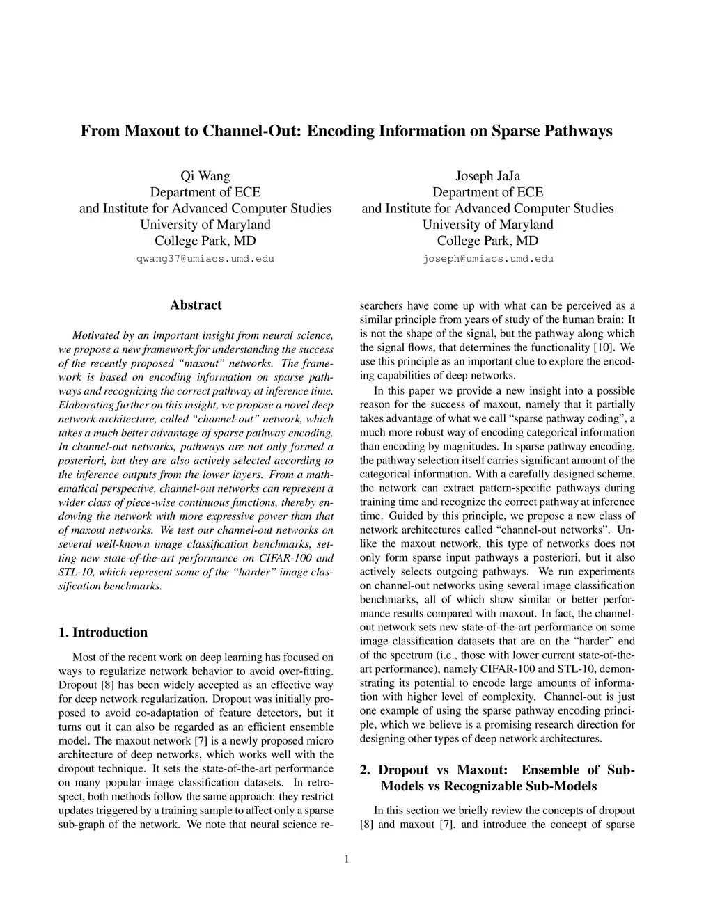Motivated by an important insight from neural science, we propose a new framework for understanding the success of the recently proposed "maxout" networks. The framework is based on encoding information on sparse pathways and recognizing the correct pathway at inference time. Elaborating further on this insight, we propose a novel deep network architecture, called "channel-out" network, which takes a much better advantage of sparse pathway encoding. In channel-out networks, pathways are not only formed a posteriori, but they are also actively selected according to the inference outputs from the lower layers. From a mathematical perspective, channel-out networks can represent a wider class of piece-wise continuous functions, thereby endowing the network with more expressive power than that of maxout networks. We test our channel-out networks on several well-known image classification benchmarks, setting new state-of-the-art performance on CIFAR-100 and STL-10, which represent some of the "harder" image classification benchmarks.