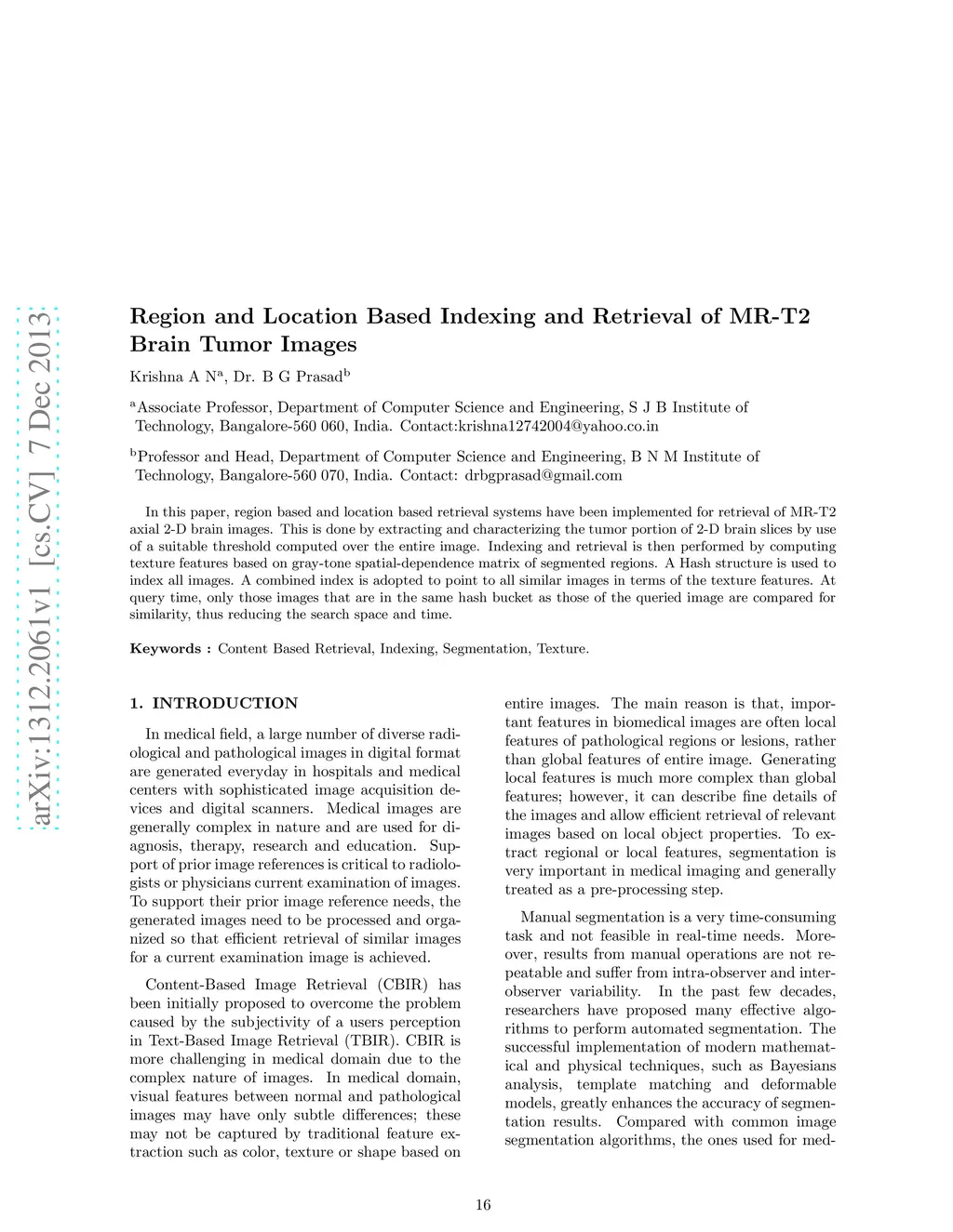 In this paper, region based and location based retrieval systems have been implemented for retrieval of MR-T2 axial 2-D brain images. This is done by extracting and characterizing the tumor portion of 2-D brain slices by use of a suitable threshold computed over the entire image. Indexing and retrieval is then performed by computing texture features based on gray-tone spatial-dependence matrix of segmented regions. A Hash structure is used to index all images. A combined index is adopted to point to all similar images in terms of the texture features. At query time, only those images that are in the same hash bucket as those of the queried image are compared for similarity, thus reducing the search space and time.