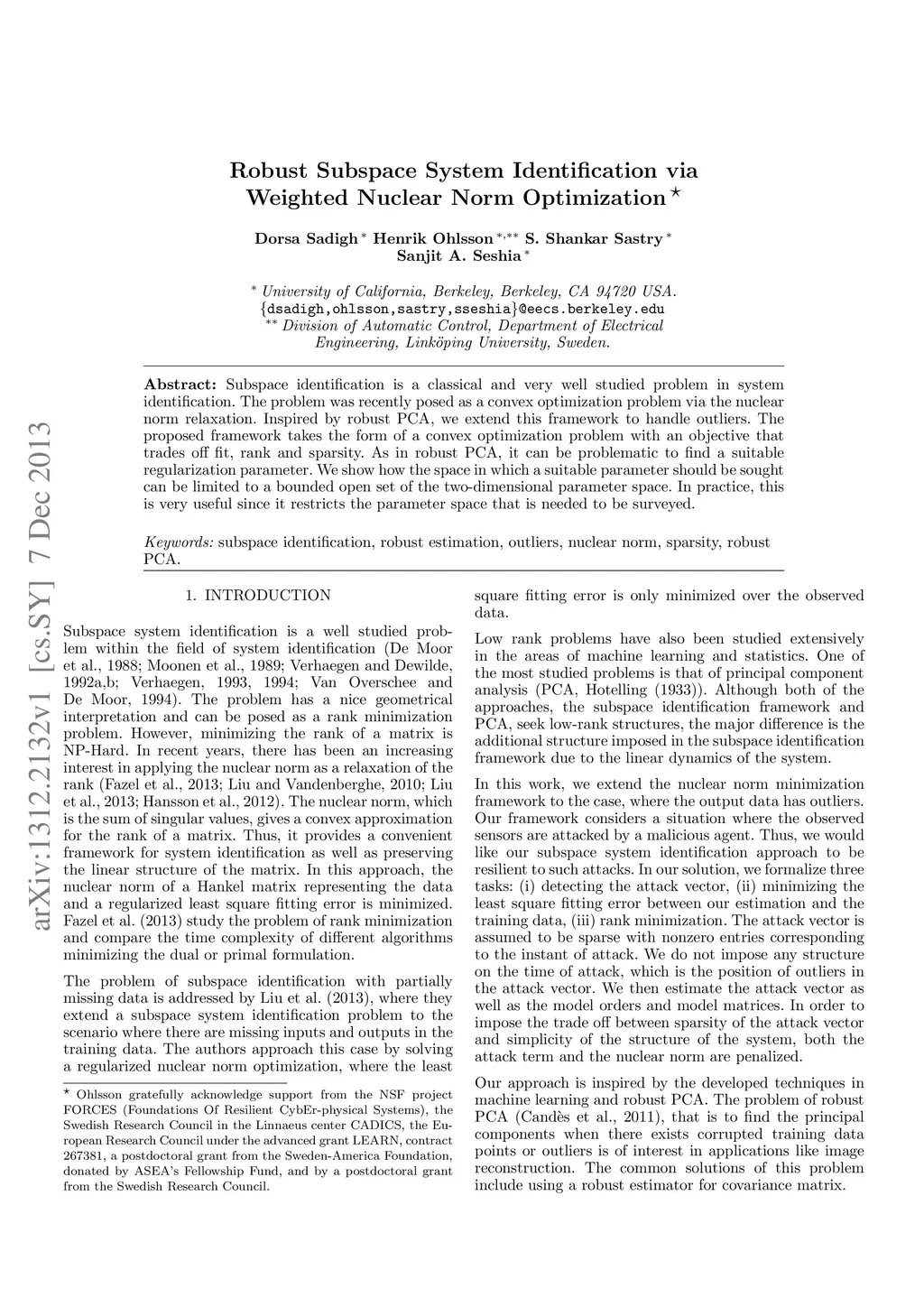 Subspace identification is a classical and very well studied problem in system identification. The problem was recently posed as a convex optimization problem via the nuclear norm relaxation. Inspired by robust PCA, we extend this framework to handle outliers. The proposed framework takes the form of a convex optimization problem with an objective that trades off fit, rank and sparsity. As in robust PCA, it can be problematic to find a suitable regularization parameter. We show how the space in which a suitable parameter should be sought can be limited to a bounded open set of the two dimensional parameter space. In practice, this is very useful since it restricts the parameter space that is needed to be surveyed.