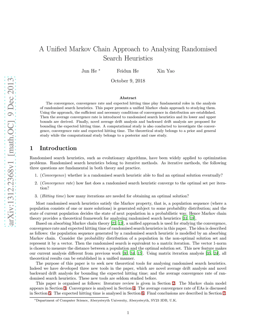 The convergence, convergence rate and expected hitting time play fundamental roles in the analysis of randomised search heuristics. This paper presents a unified Markov chain approach to studying them. Using the approach, the sufficient and necessary conditions of convergence in distribution are established. Then the average convergence rate is introduced to randomised search heuristics and its lower and upper bounds are derived. Finally, novel average drift analysis and backward drift analysis are proposed for bounding the expected hitting time. A computational study is also conducted to investigate the convergence, convergence rate and expected hitting time. The theoretical study belongs to a prior and general study while the computational study belongs to a posterior and case study.