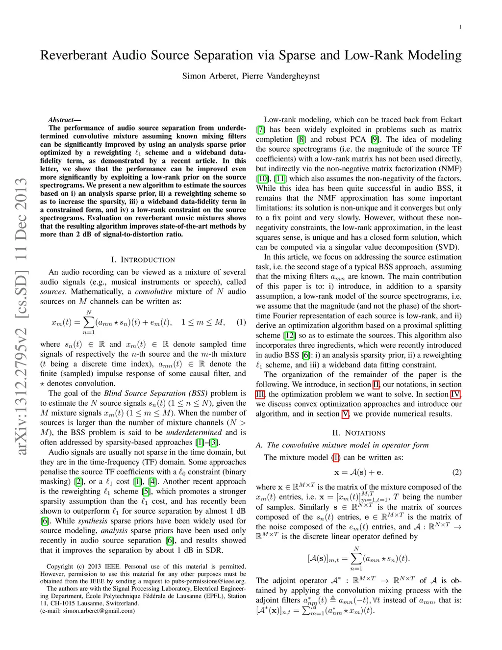 Reverberant Audio Source Separation via Sparse and Low-Rank Modeling