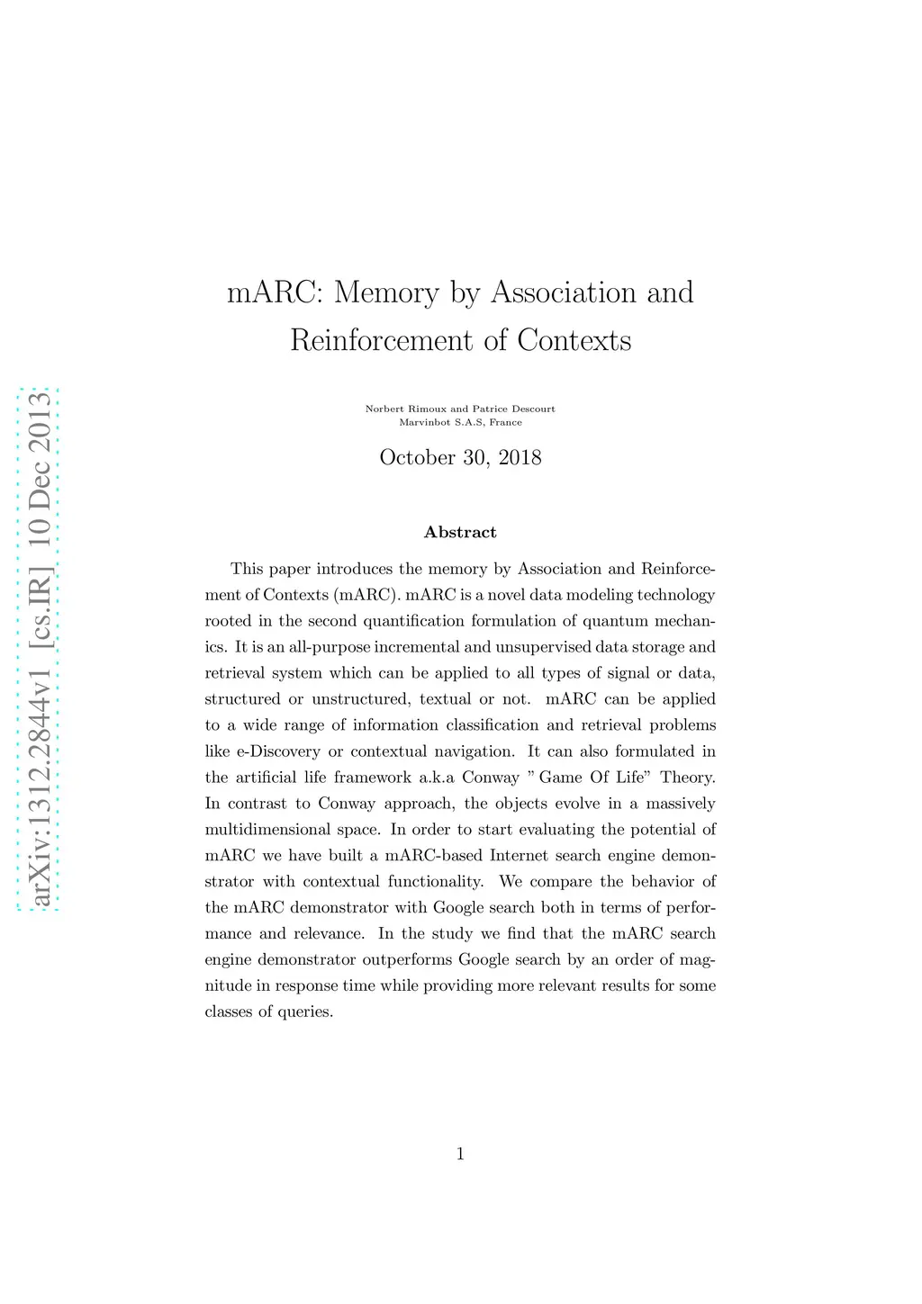This paper introduces the memory by Association and Reinforcement of Contexts (mARC). mARC is a novel data modeling technology rooted in the second quantization formulation of quantum mechanics. It is an all-purpose incremental and unsupervised data storage and retrieval system which can be applied to all types of signal or data, structured or unstructured, textual or not. mARC can be applied to a wide range of information clas-sification and retrieval problems like e-Discovery or contextual navigation. It can also for-mulated in the artificial life framework a.k.a Conway "Game Of Life" Theory. In contrast to Conway approach, the objects evolve in a massively multidimensional space. In order to start evaluating the potential of mARC we have built a mARC-based Internet search en-gine demonstrator with contextual functionality. We compare the behavior of the mARC demonstrator with Google search both in terms of performance and relevance. In the study we find that the mARC search engine demonstrator outperforms Google search by an order of magnitude in response time while providing more relevant results for some classes of queries.