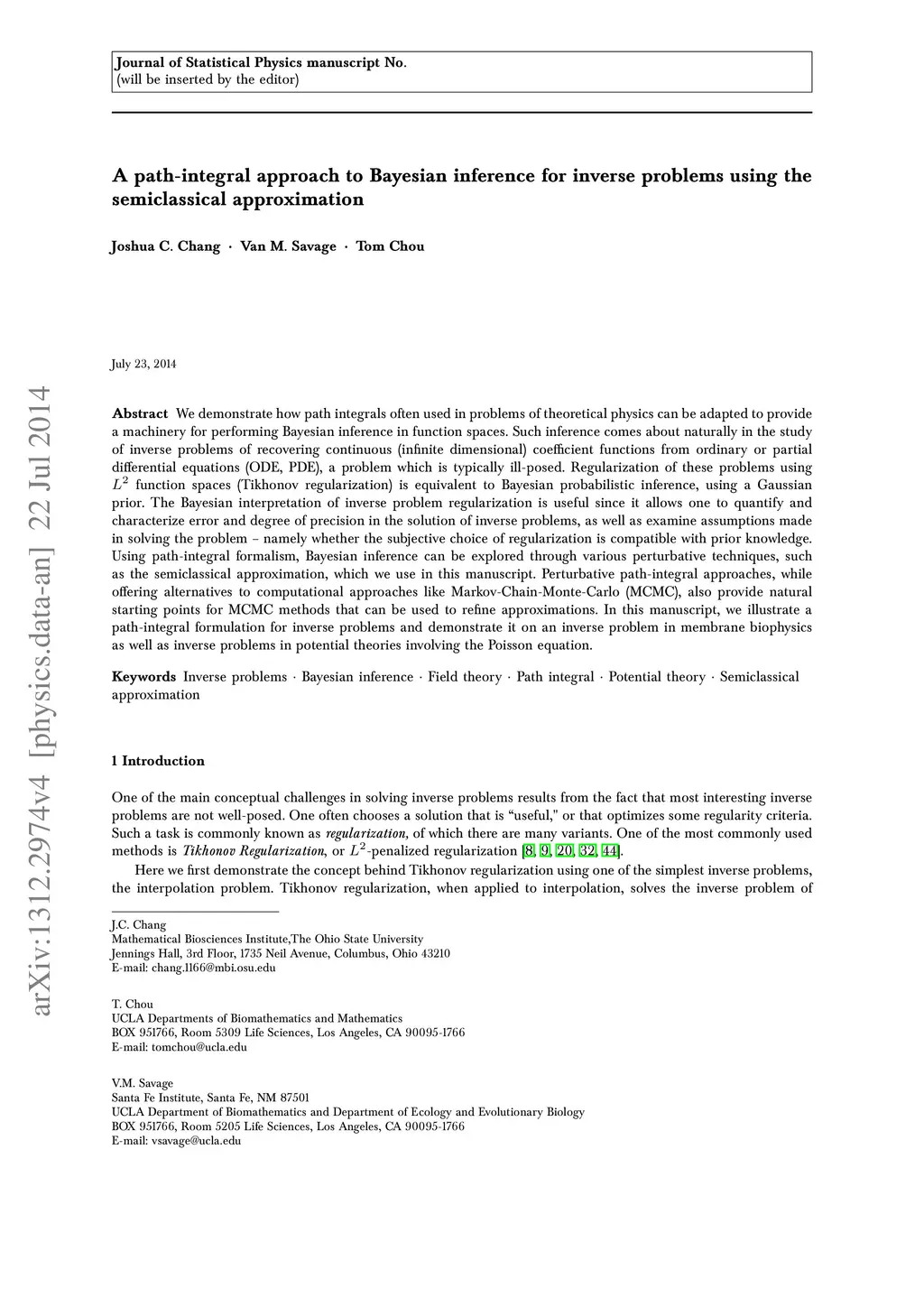 We demonstrate how path integrals often used in problems of theoretical physics can be adapted to provide a machinery for performing Bayesian inference in function spaces. Such inference comes about naturally in the study of inverse problems of recovering continuous (infinite dimensional) coefficient functions from ordinary or partial differential equations (ODE, PDE), a problem which is typically ill-posed. Regularization of these problems using function spaces (Tikhonov regularization) is equivalent to Bayesian probabilistic inference, using a Gaussian prior. The Bayesian interpretation of inverse problem regularization is useful since it allows one to quantify and characterize error and degree of precision in the solution of inverse problems, as well as examine assumptions made in solving the problem -- namely whether the subjective choice of regularization is compatible with prior knowledge. Using path-integral formalism, Bayesian inference can be explored through various perturbative techniques, such as the semiclassical approximation, which we use in this manuscript. Perturbative path-integral approaches, while offering alternatives to computational approaches like Markov-Chain-Monte-Carlo (MCMC), also provide natural starting points for MCMC methods that can be used to refine approximations. In this manuscript, we illustrate a path-integral formulation for inverse problems and demonstrate it on an inverse problem in membrane biophysics as well as inverse problems in potential theories involving the Poisson equation.