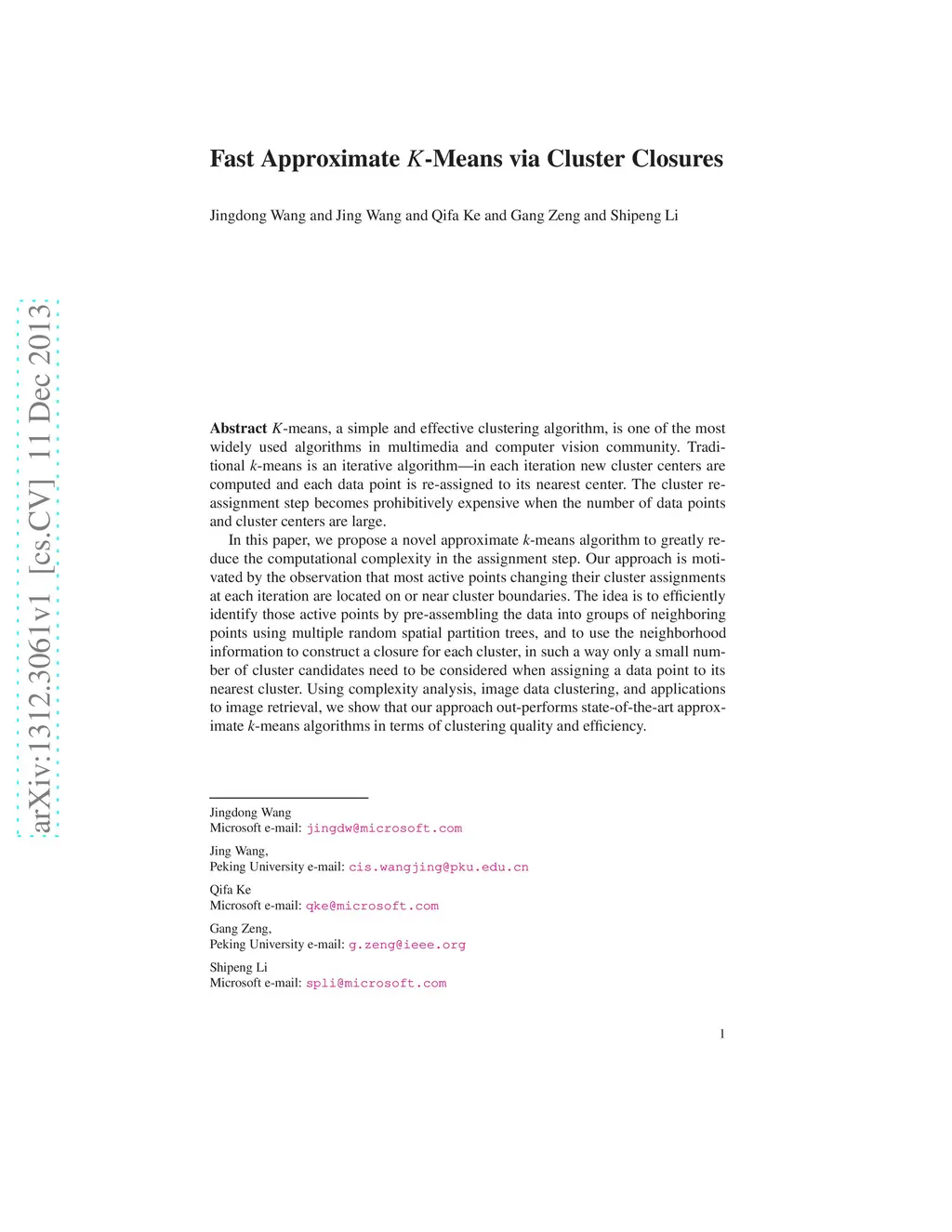 -means, a simple and effective clustering algorithm, is one of the most widely used algorithms in multimedia and computer vision community. Traditional -means is an iterative algorithm---in each iteration new cluster centers are computed and each data point is re-assigned to its nearest center. The cluster re-assignment step becomes prohibitively expensive when the number of data points and cluster centers are large. In this paper, we propose a novel approximate -means algorithm to greatly reduce the computational complexity in the assignment step. Our approach is motivated by the observation that most active points changing their cluster assignments at each iteration are located on or near cluster boundaries. The idea is to efficiently identify those active points by pre-assembling the data into groups of neighboring points using multiple random spatial partition trees, and to use the neighborhood information to construct a closure for each cluster, in such a way only a small number of cluster candidates need to be considered when assigning a data point to its nearest cluster. Using complexity analysis, image data clustering, and applications to image retrieval, we show that our approach out-performs state-of-the-art approximate -means algorithms in terms of clustering quality and efficiency.