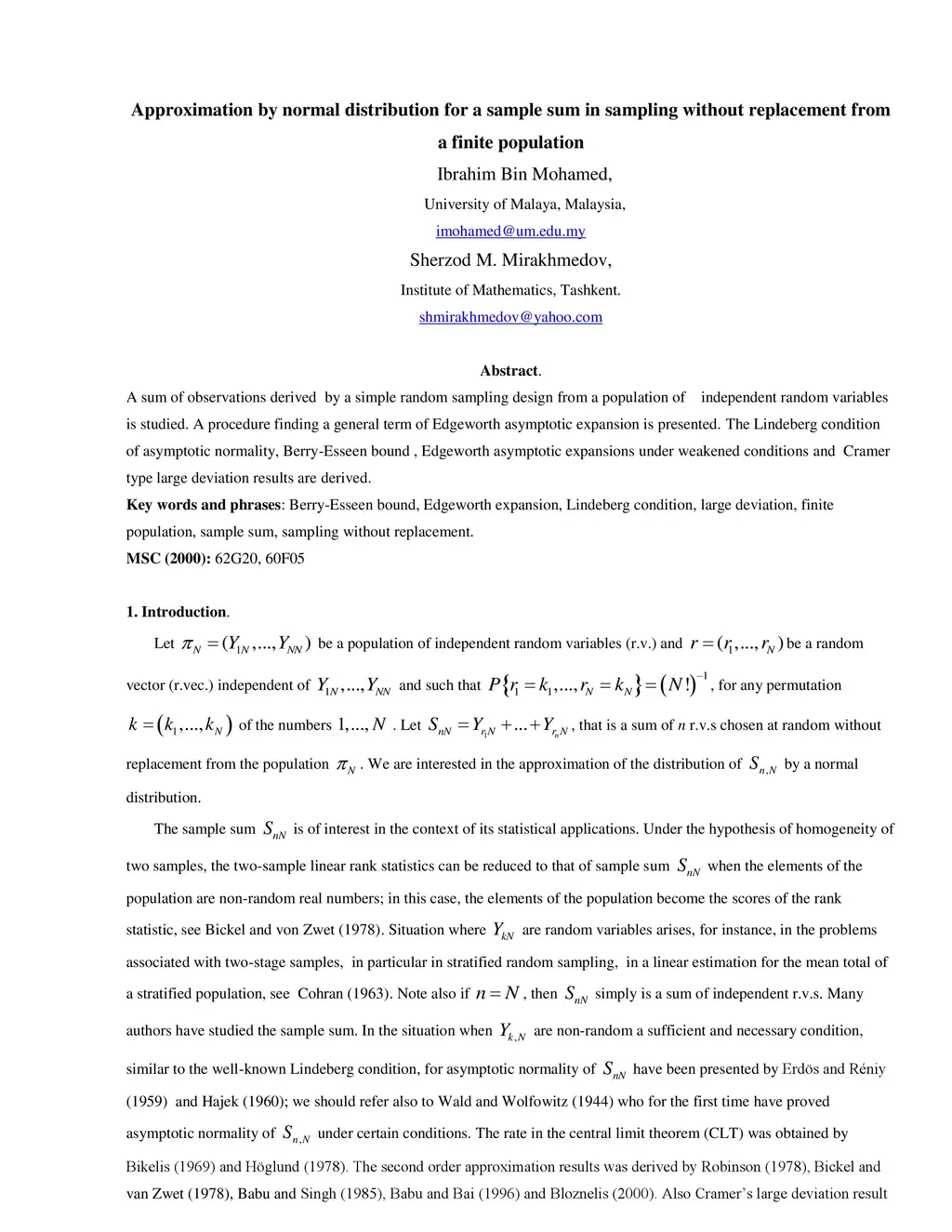 A sum of observations derived by a simple random sampling design from a population of independent random variables is studied. A procedure finding a general term of Edgeworth asymptotic expansion is presented. The Lindeberg condition of asymptotic normality, Berry-Esseen bound, Edgeworth asymptotic expansions under weakened conditions and Cramer type large deviation results are derived.